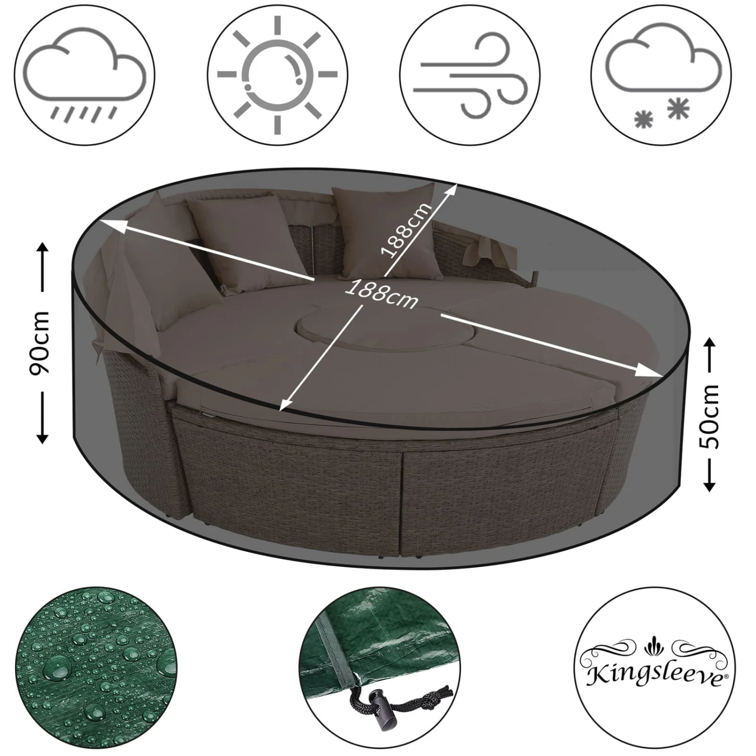 - Maße (Ø/H): 188 x 90-50 cm – rund