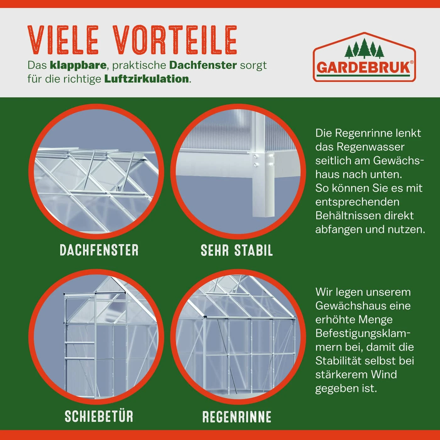 Gewächshaus 7,6 m³ mit 2 Dachfenstern, Regenrinne und Stahlfundament