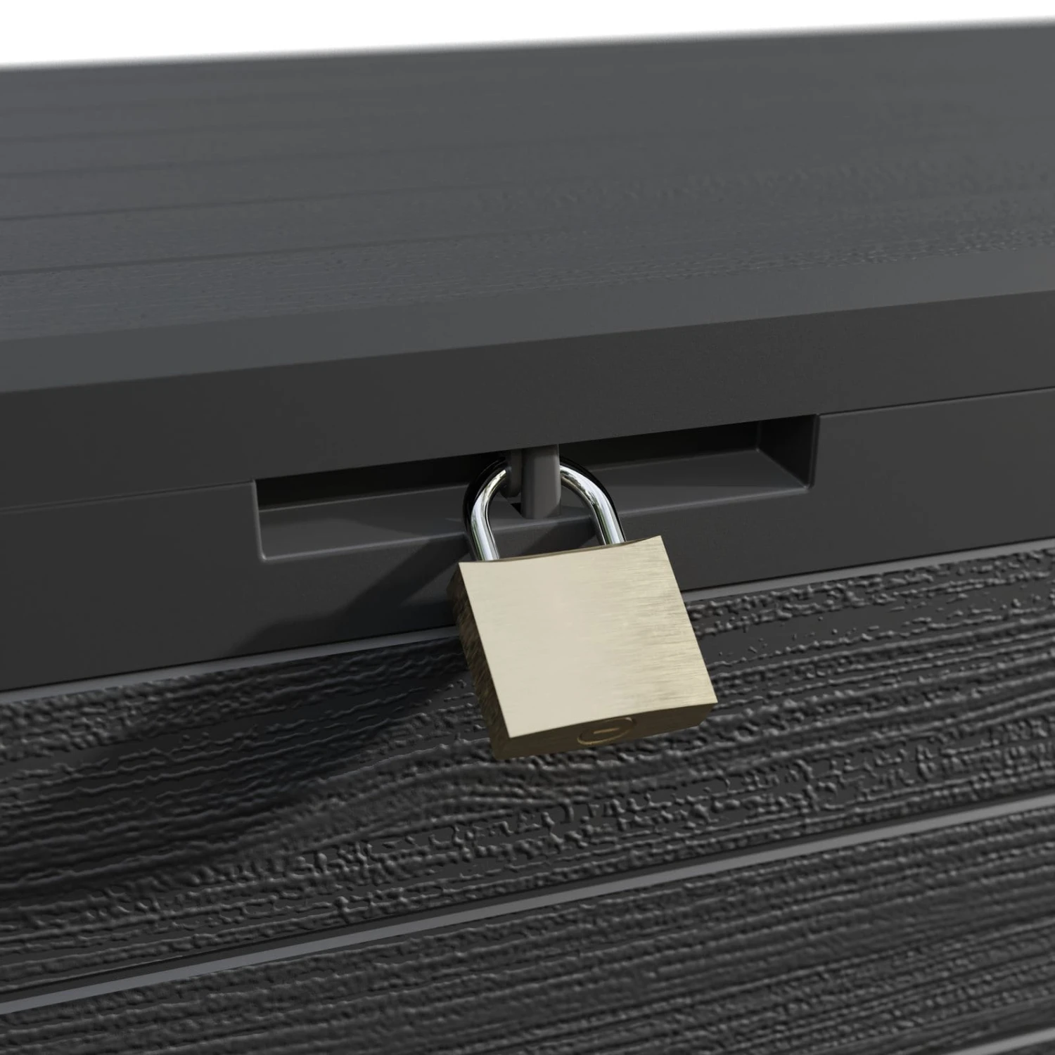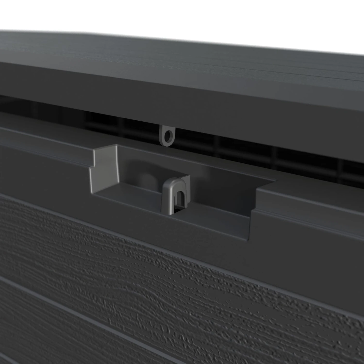 Die robuste Gartenbox im angesagten Holzdesign bietet mit einem Fassungsvermögen von 280 Litern ausreichend Platz für Ihre Sitzauflagen, Kissen, Gartenaccessoires und vieles mehr. Die Auflagenbox aus Kunststoff verfügt über einen klappbaren Deckel mit integrierter Abschließvorrichtung. Durch die praktischen Griffmulden lässt sich die Box einfach platzieren und umstellen.