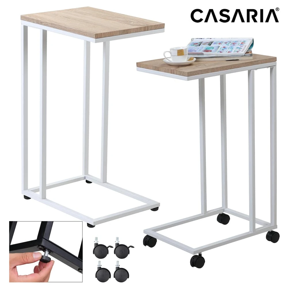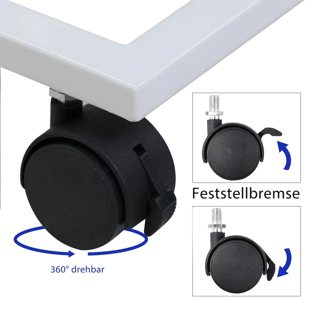 Der Beistelltisch verfügt über 4 abnehmbare Standfüße. Die Füße können im Handumdrehen zu vier leichtgängigen Rollen gewechselt werden. Der Tisch lässt sich so kinderleicht verschieben. Um ein Verrutschen am Bett oder der Couch zu verhindern haben 2 der 4 Rollen Bremsen.