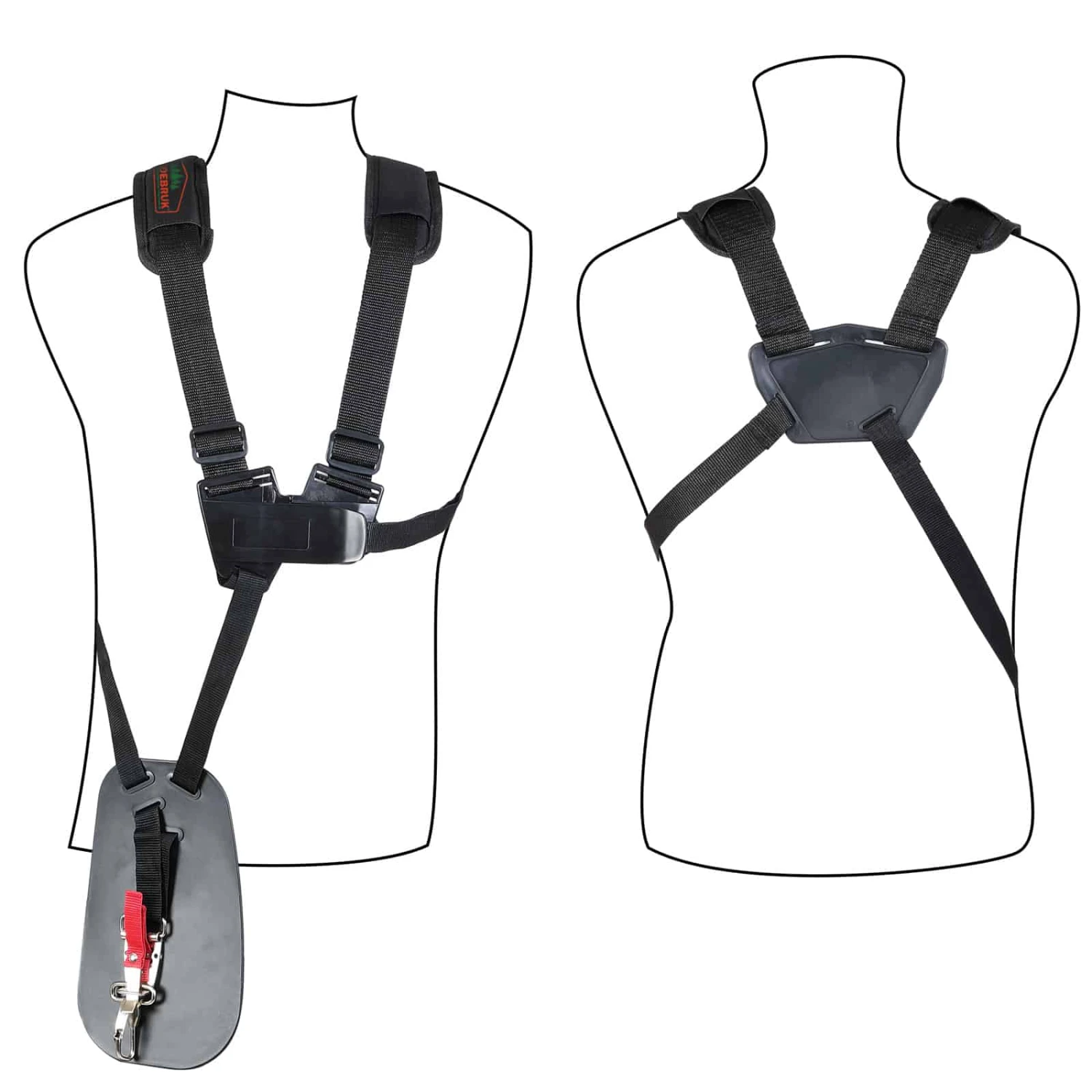 Der geteilte Schaft und die Schnellverschlüsse sorgen für einen einfachen Austausch der Aufsätze und erleichtern den Transport sowie die Aufbewahrung. Der enthaltene Schultergurt mit Hüftschutz lässt Sie das Gerät kraftschonend und sicher bedienen. Alle Aufsätze sind mit einem Klingenschutz versehen, die Sie jederzeit wieder anbringen können. So wird alles sicher verstaut!