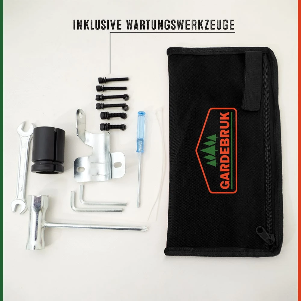 - 1 x benzinbetriebenes Multifunktions-Gartenwerkzeug inkl. 5 verschiedenen Aufsätzen, Tragegurt und Wartungswerkzeugen