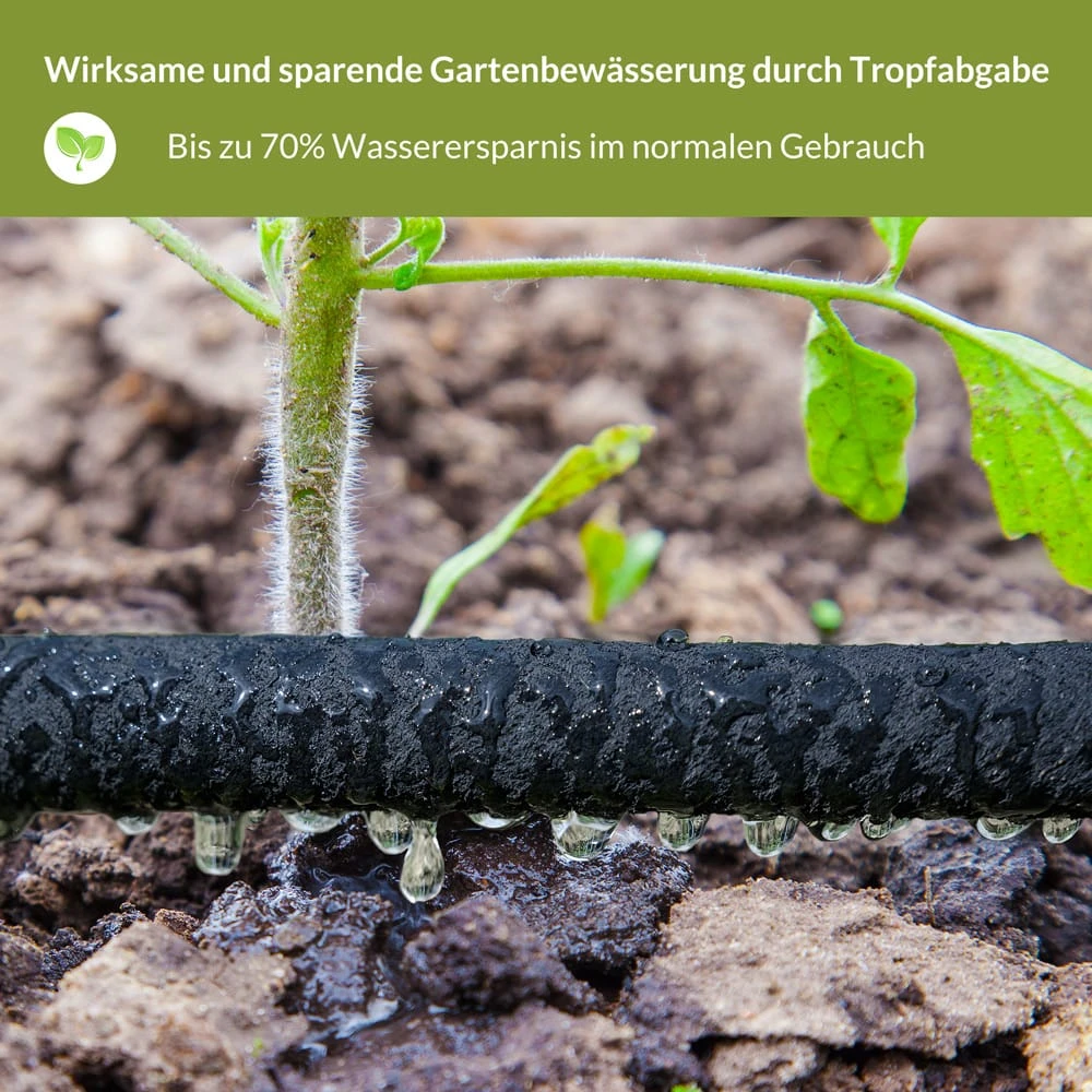 Im Vergleich zu traditionellen Bewässerungssystemen ermöglicht die tropfenweise Wasserabgabe dieses Schlauchsystems, je nach Verlegesituation, eine Wasserersparnis von bis zu 70% !!!
