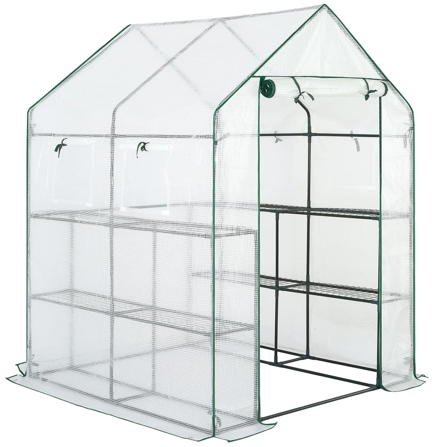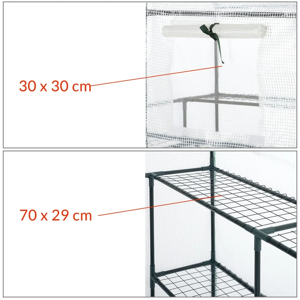 Im Inneren bieten 2 Steckregale mit je 4 Ablagen viel Platz für Pflanzen. Die Regalböden können jeweils mit bis zu 10 kg belastet werden.