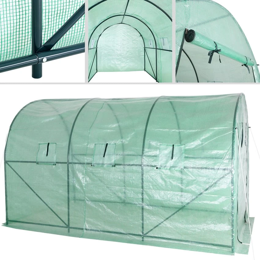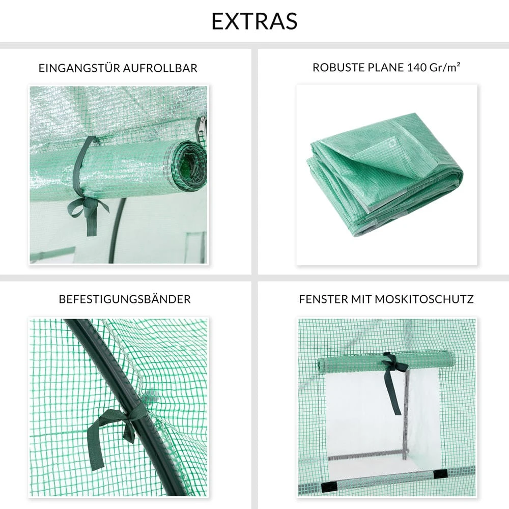 Die Folie lässt immer genügend Sonnenlicht durch und speichert außerdem Feuchtigkeit und Wärme. Sollte es zu heiß werden, öffnen Sie einfach den Reißverschluss der Tür und Fenster und rollen diese auf. So wird eine ideale Luftzirkulation gewährleistet. Die Fenster haben zusätzlich Fliegengitter um Insekten fernzuhalten.