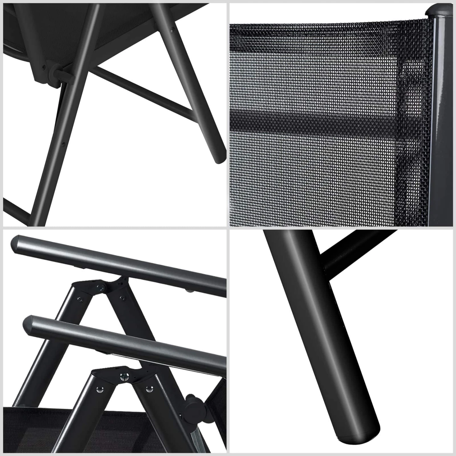 Die Aluminium-Sitzgruppe besteht aus 1 Tisch und 4 klappbaren Hochlehnern mit verstellbaren Rückenlehnen.