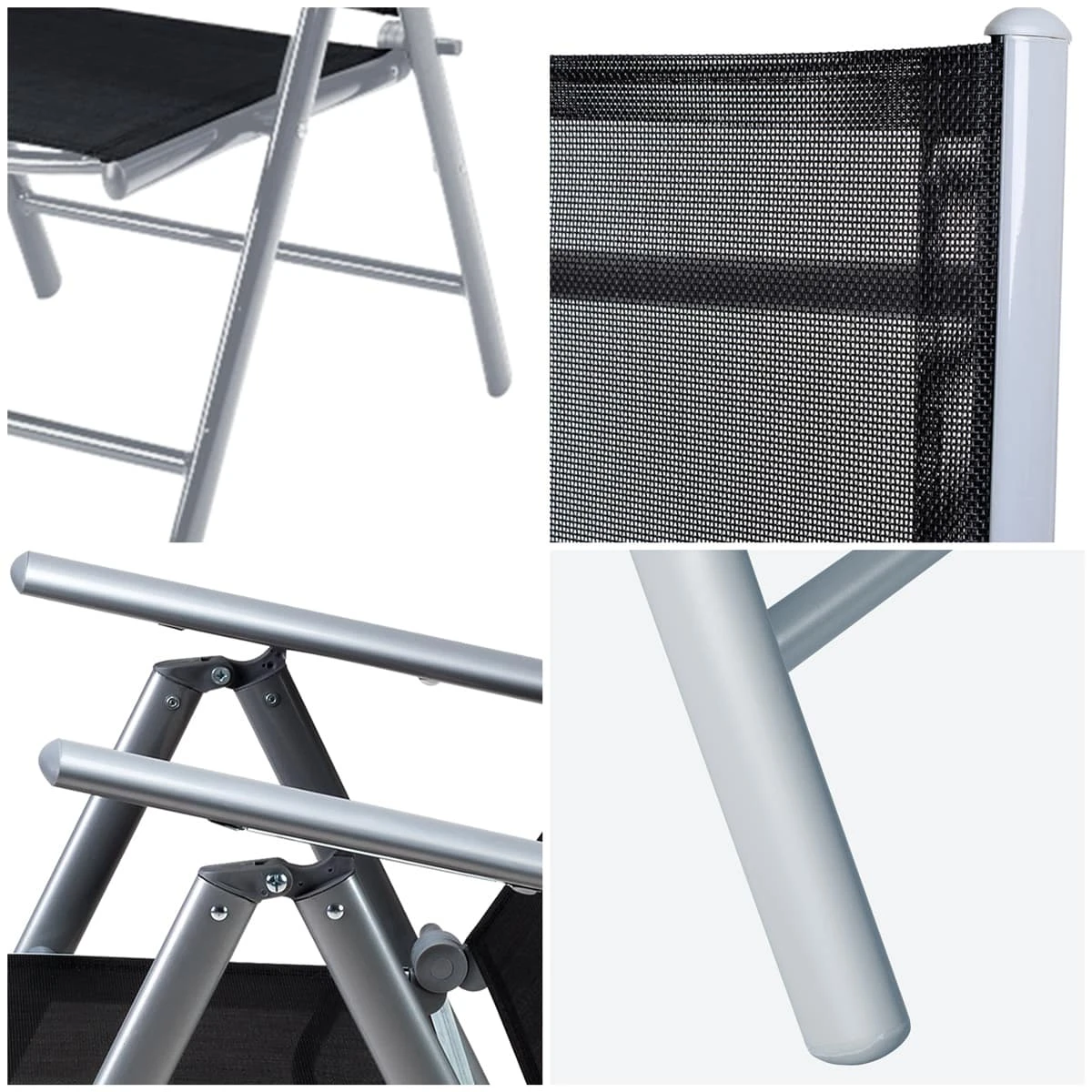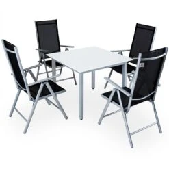 Die Aluminium-Sitzgruppe besteht aus 1 Tisch und 4 klappbaren Hochlehnern mit verstellbaren Rückenlehnen.