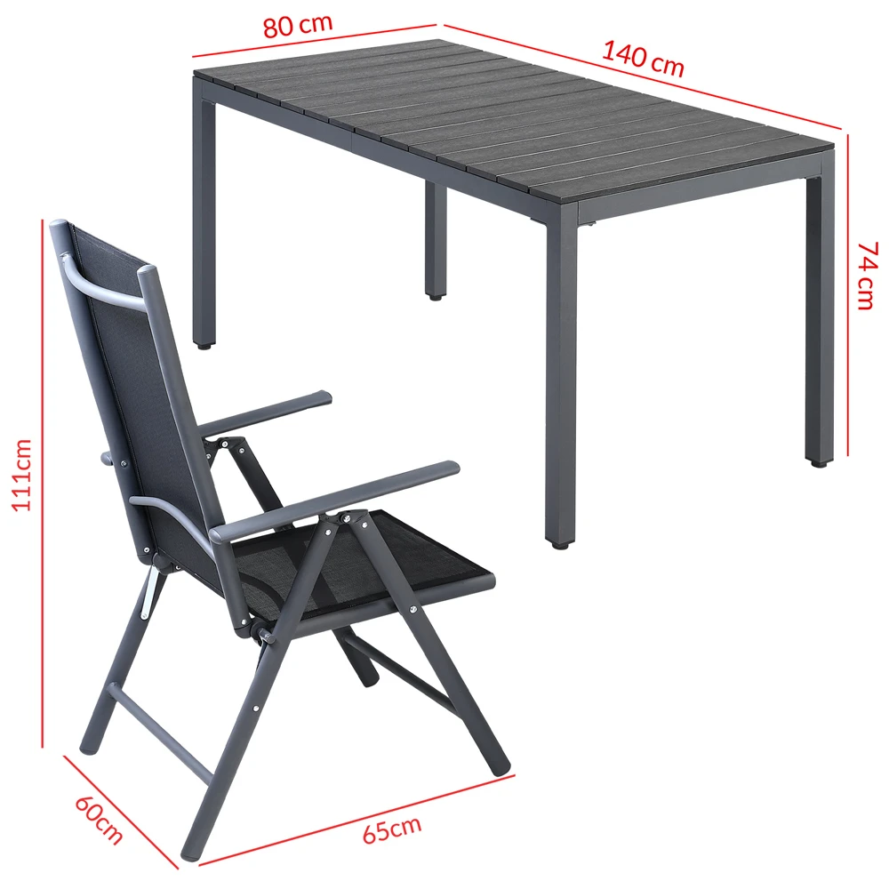 - Material Rahmen Tisch / Stuhl: pulverbeschichtetes Aluminium mit Edelstahlschrauben