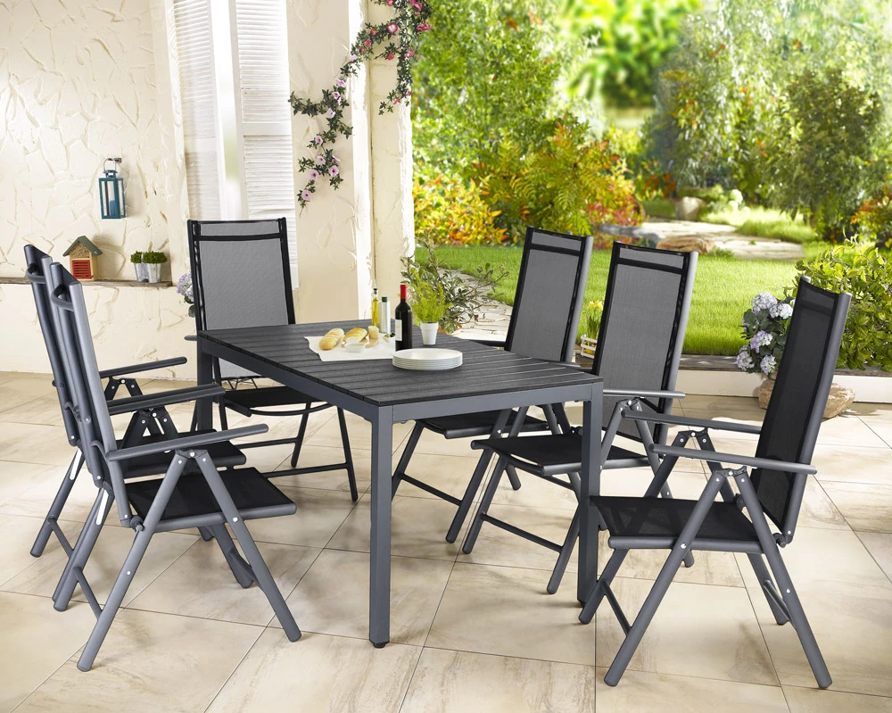 Exklusive, 7-tlg. Aluminium Gartengarnitur Bern mit WPC Tischplatte und 6 klappbaren und in 7 Positionen verstellbaren Hochlehnern