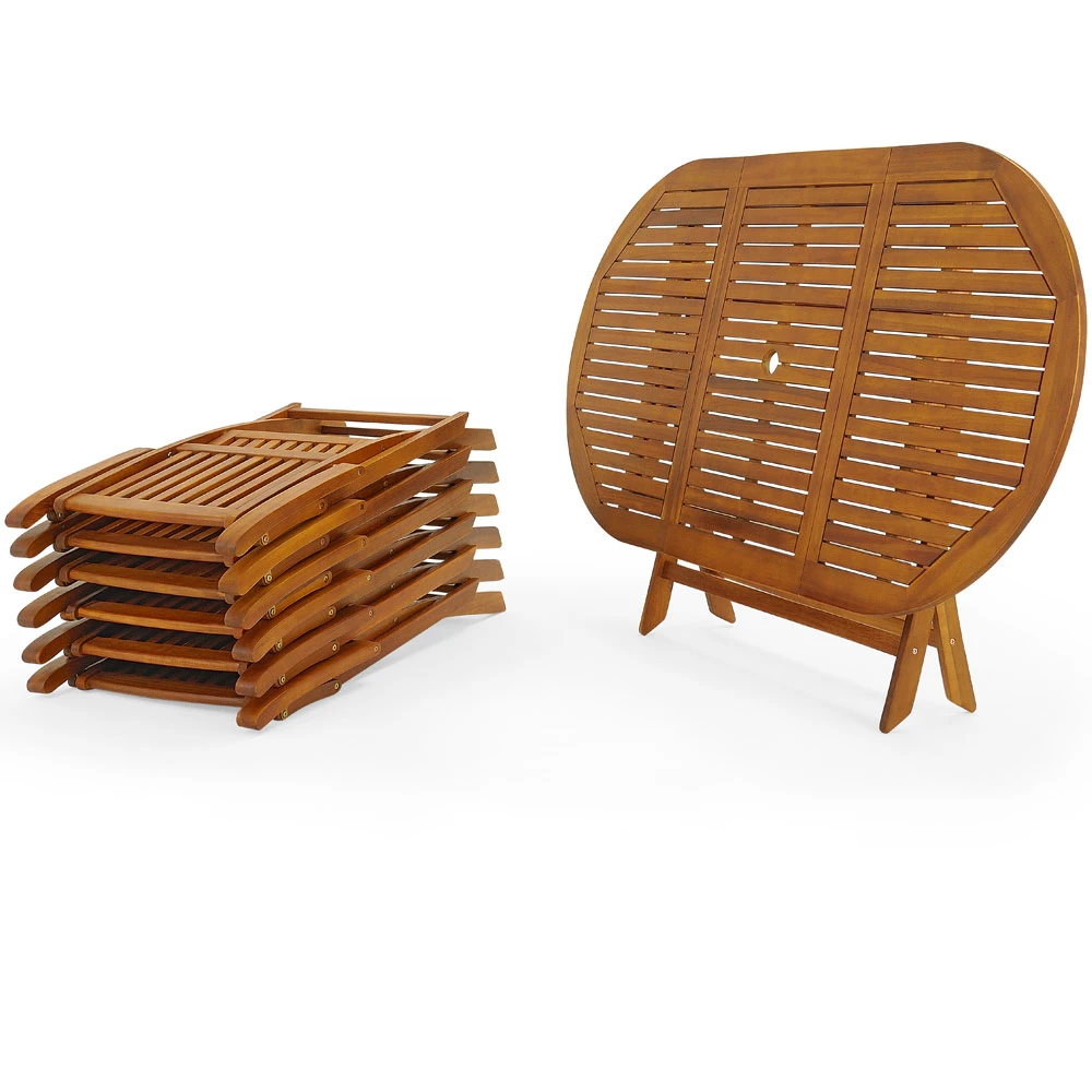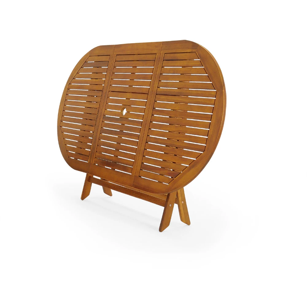 Die Stühle und der Tisch der Gartengarnitur sind bei Nichtbenutzung platzsparend zusammenklappbar. Gelenke und Scharniere sind aus galvanisiertem Metall hergestellt und in der Mitte der Tischplatte befindet sich eine Halterung für einen Sonnenschirm.