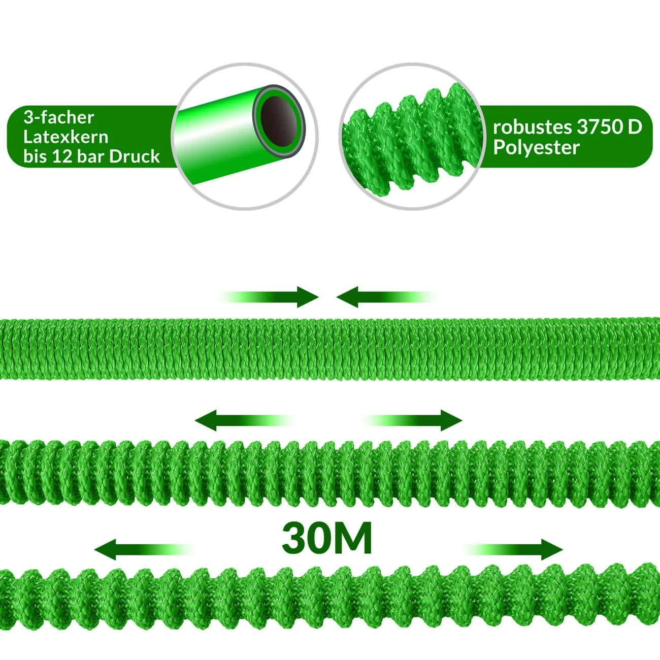 Der hochwertige Flexschlauch von Gardebruk® eignet sich ideal zum Bewässern Ihres Gartens. Er kann auch zur Reinigung von hartnäckigen Verschmutzungen in der Heimwerkstatt oder zur Autowäsche verwendet werden. Der Schlauch besteht aus 3.750D x 3.750D Polyester mit einem 3-fach Latexkern, hält einem Wasserdruck von bis zu 12 bar stand und durch das robuste Material ist er besonders langlebig.