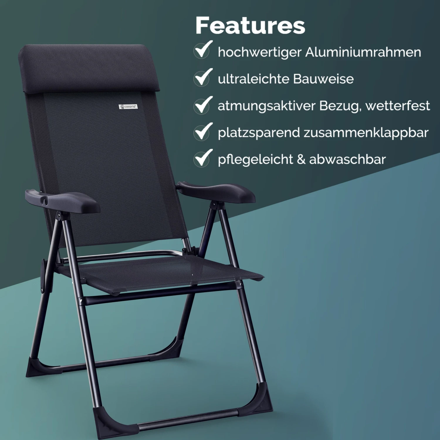 Der Textilbezug aus Polyester ist atmungsaktiv, wasserabweisend beschichtet und abwischbar. Auch bei hohen Temperaturen und längerem Sitzen ist damit für eine angenehme Klimatisierung und Durchlüftung der Sitzfläche gesorgt. Das leichte Aluminiumgestell lässt sich in Sekunden auf- und wieder zuklappen und der Stuhl kann mit einer Hand getragen werden. Für den Transport lässt er sich sehr dünn zusammenklappen und platzsparend verstauen.