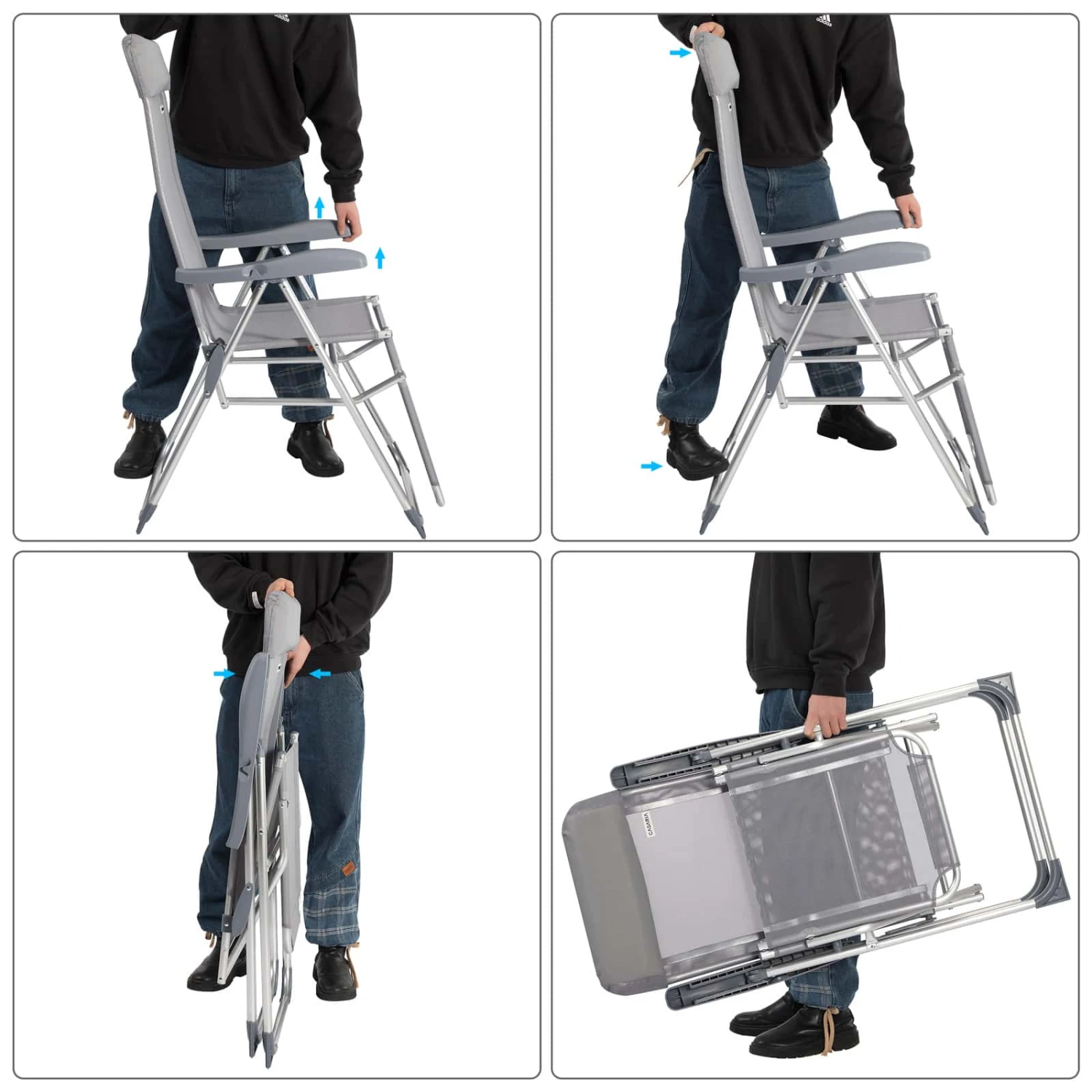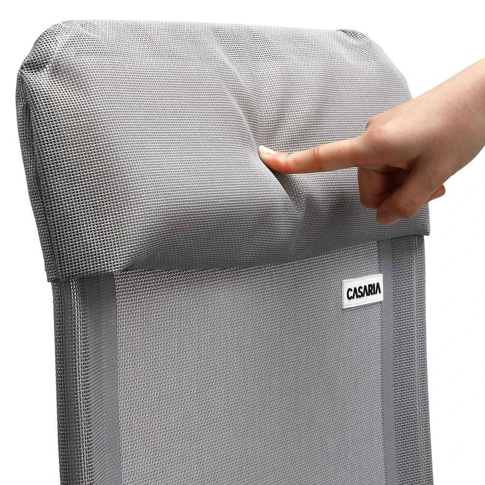 Die Hochlehner sind 7-fach verstellbar und bestehen aus einem hochwertigen Aluminiumrahmen. Der Kopfbereich ist mit einem bequemen Polster ausgestattet.