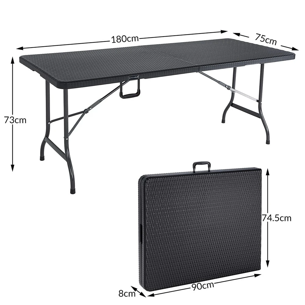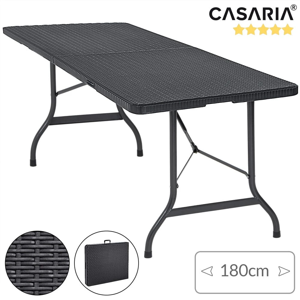 Der große Gartentisch von Casaria® im schicken Rattan Look ist mit wenigen Handgriffen einfach klappbar und hat ein kofferraumfreundliches Packmaß von nur 90 cm Länge, ideal auch zum Verstauen bei Nichtgebrauch. Platz bietet der Campingtisch für bis zu 8 Personen.