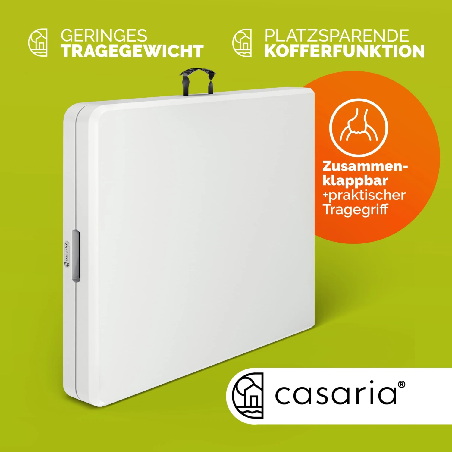 Der große Gartentisch von Casaria® ist mit wenigen Handgriffen einfach klappbar und hat ein kofferraumfreundliches Packmaß von nur 110 cm Länge, ideal auch zum Verstauen bei Nichtgebrauch. Platz bietet der Campingtisch für bis zu 10 Personen.