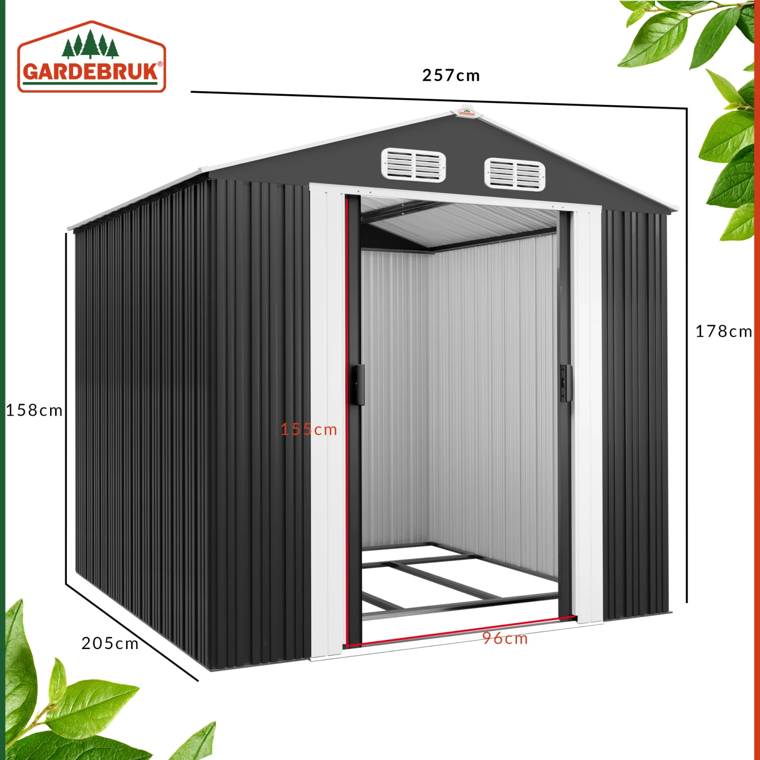 – Gesamtgröße mit Dach (LxTxH): 257 x 205 x 177,5 cm