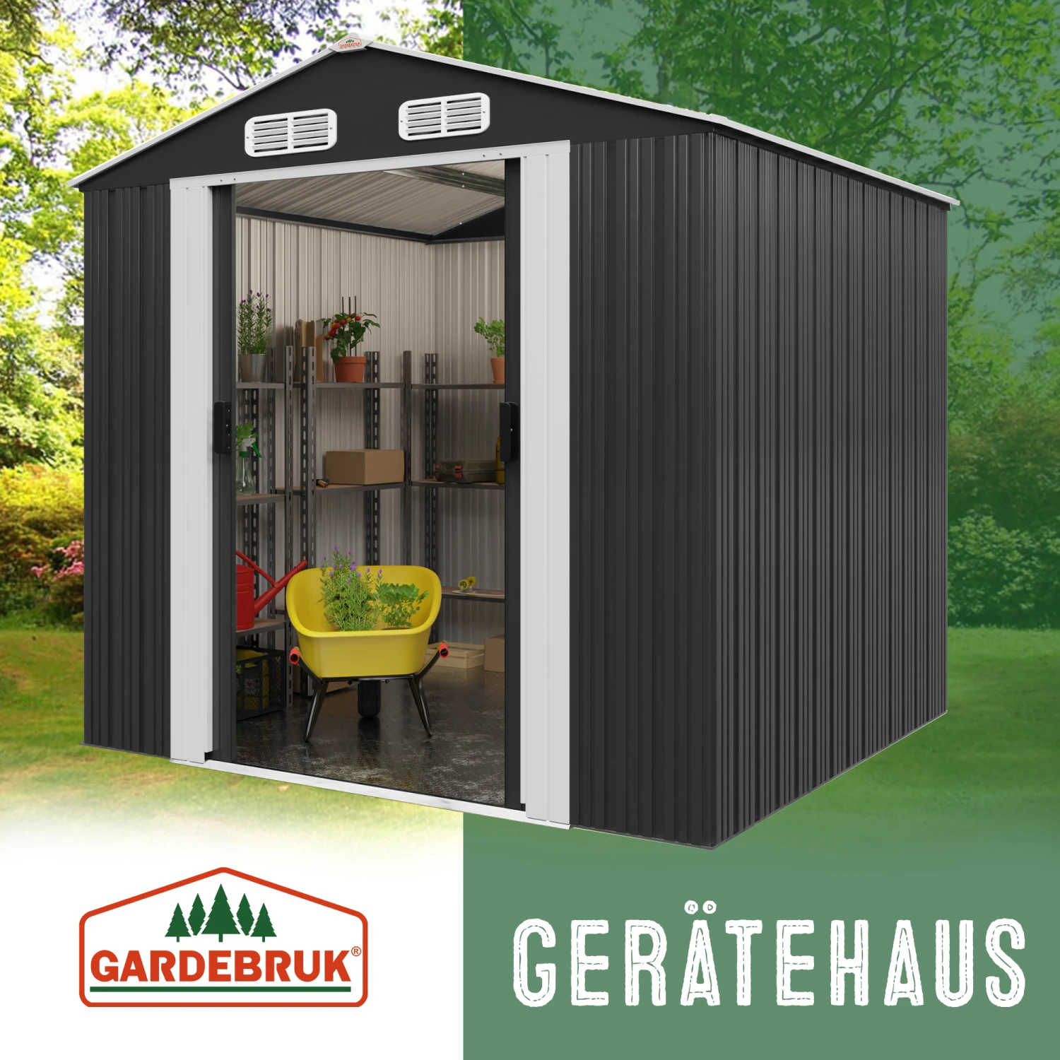 In diesem Gerätehaus sind Ihre Gartengeräte sicher verstaut. Der verzinkte Bodenkranz ermöglicht zudem die Montage eines Holzbodens (dieser ist nicht im Lieferumfang enthalten).Das Gartenhaus bietet Platz für Fahrräder, Werkzeuge und andere Gartenutensilien. Es besitzt außerdem eine zweigeteilte Schiebetür, 4 Belüftungsöffnungen an der Oberseite (jeweils 2 x vorne und hinten) und wird inklusive Bodenleiste geliefert.