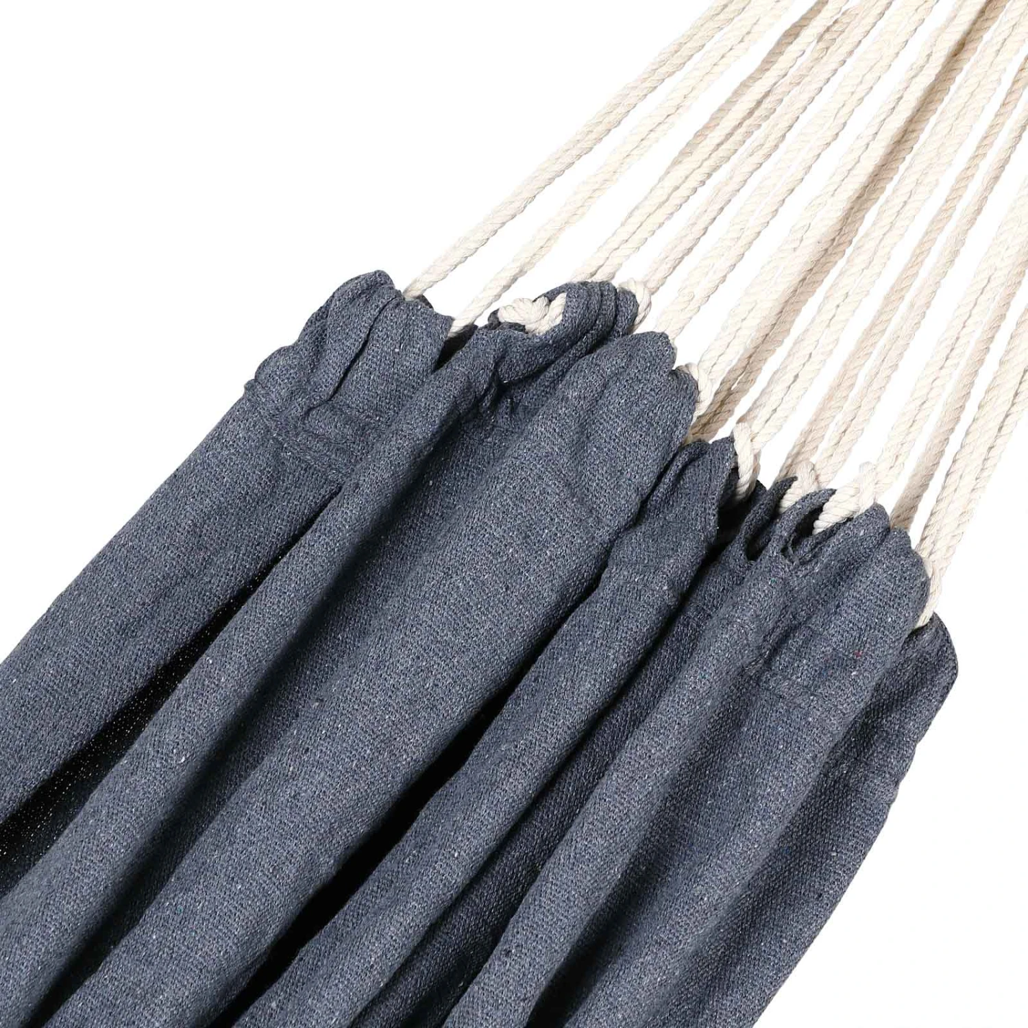 Die Hängematte besteht aus atmungsaktivem 320 g/m² Baumwoll-Polyester-Gemisch, der anschmiegsame Stoff ist hautfreundlich, wetterfest und wasserabweisend. Die Seile sind durch die gedrehten Zöpfe an den Enden sehr robust.