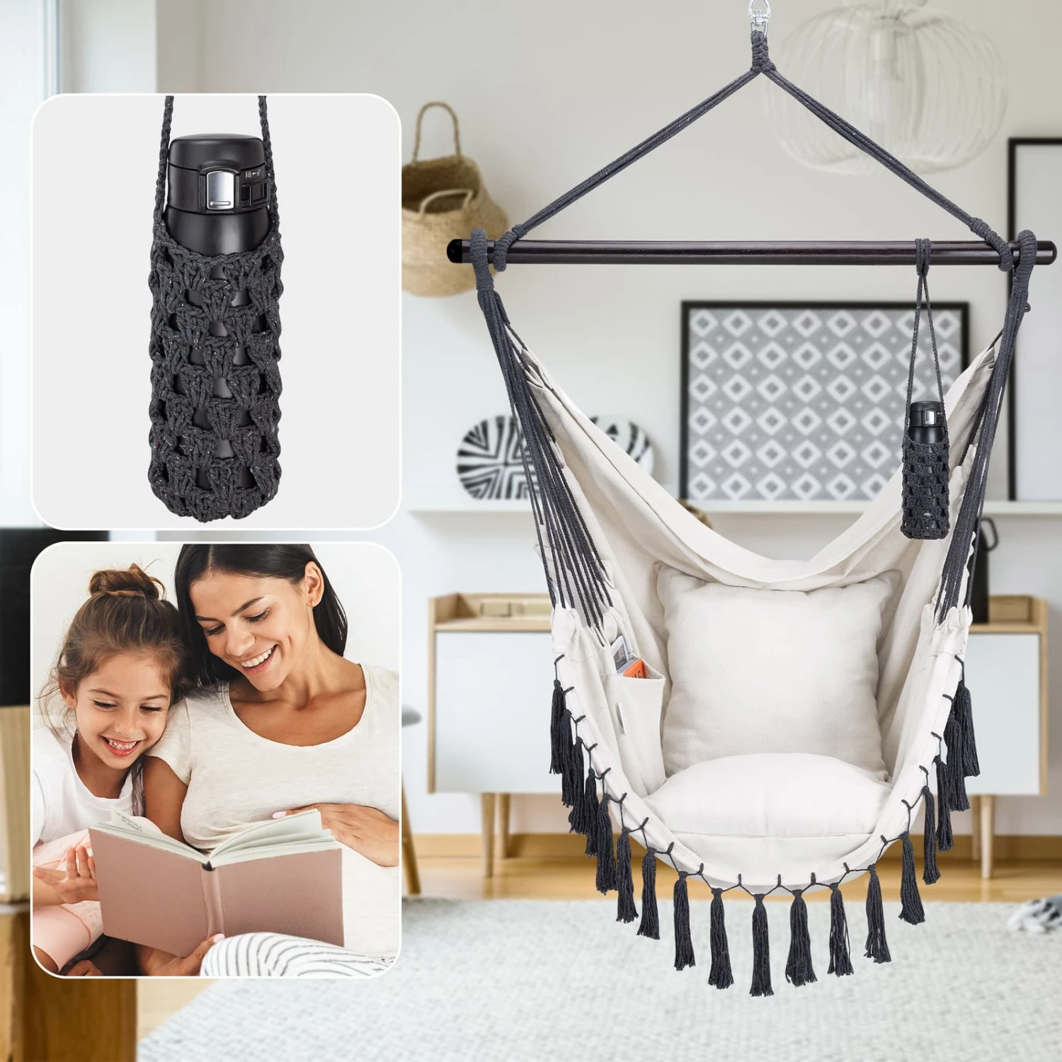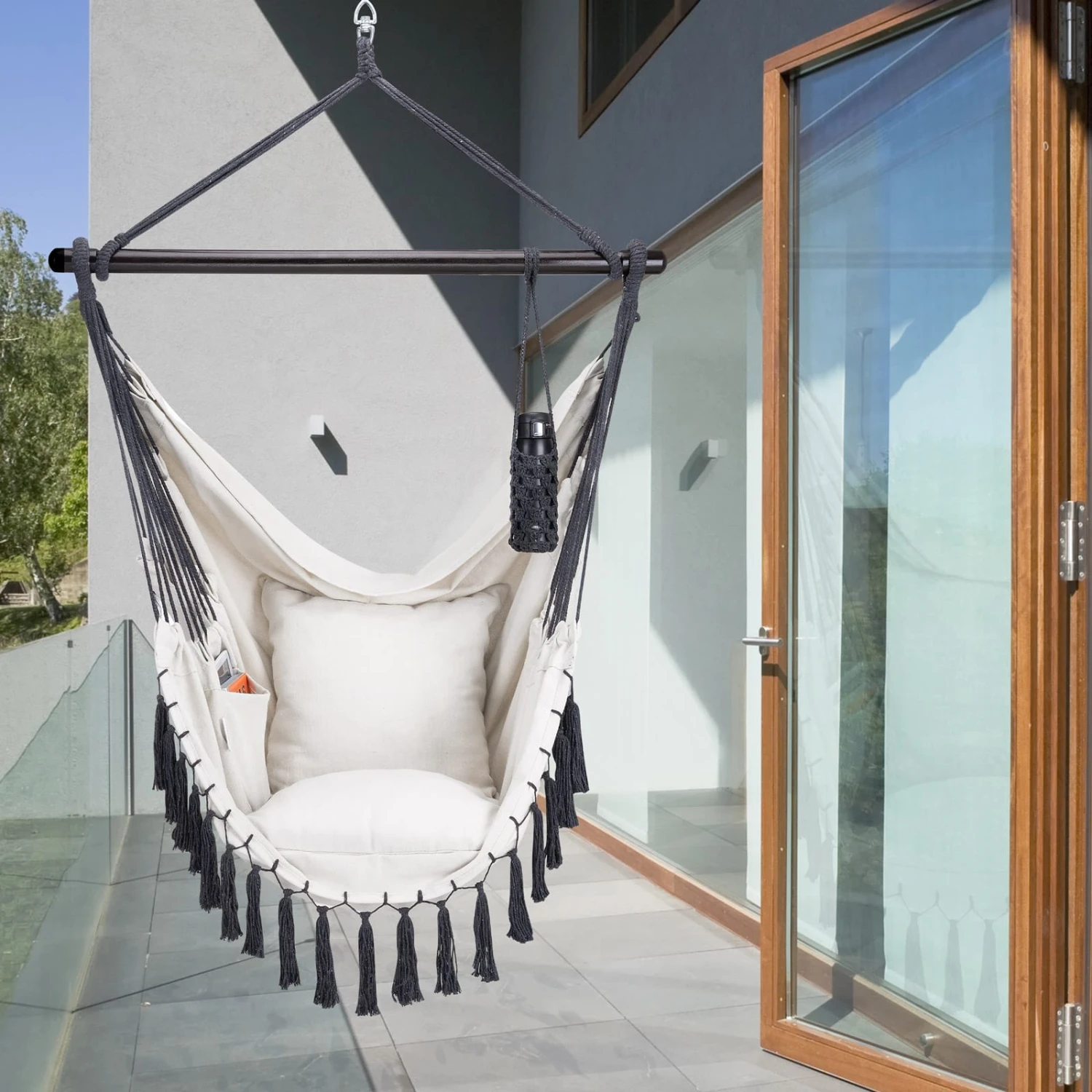 Der bequeme Hängesessel von Detex® bietet mit den 2 abnehmbaren Kissen einen sehr hohen Sitzkomfort. Dank der integrierten, großen Innentasche haben Sie Ihr Handy, Tablet oder Ihre Bücher schnell zur Hand. Der praktische Getränkehalter hält auch schwere 1-Literflaschen sicher am Platz. Der Flaschenhalter kann flexibel an der Haltestange befestigt werden und das Getränk ist so stets griffbereit.