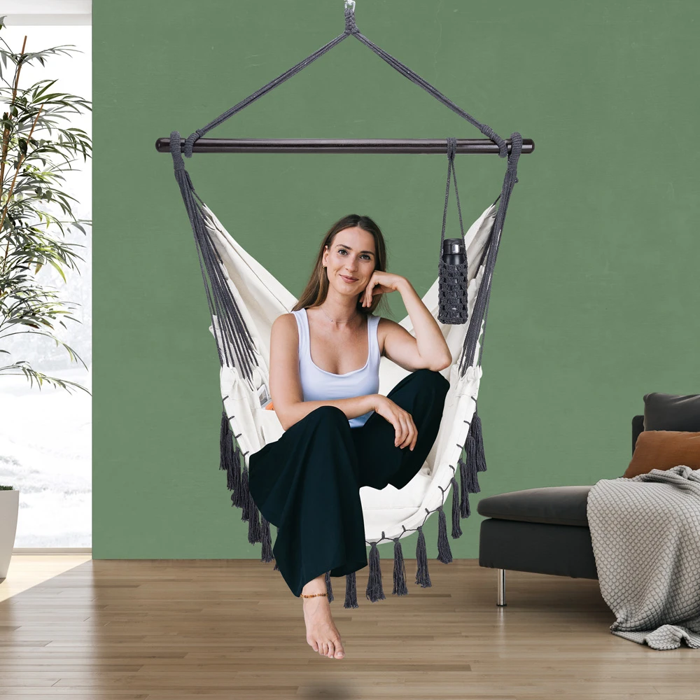 Mit der 360° Komfort-Drehwirbel-Aufhängung an einem massiven Stahl-Haken kann der Hängesessel individuell ausgerichtet und in alle Richtungen geschaukelt werden.