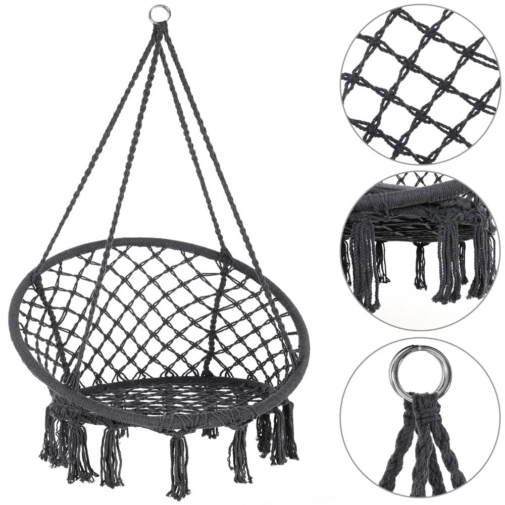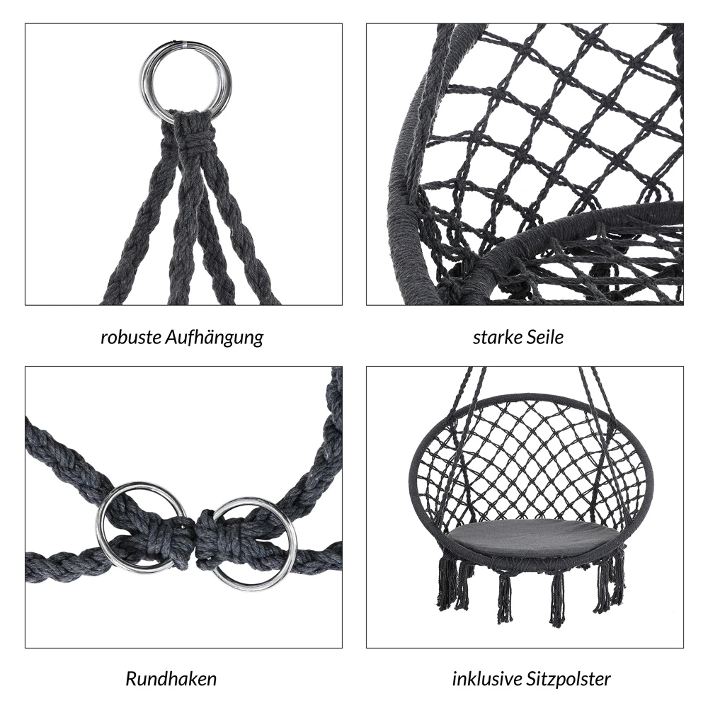 Das dazugehörige Sitzpolster sorgt nicht nur für mehr Bequemlichkeit, es besteht aus atmungsaktivem 320 g/m² Baumwoll-Polyester-Gemisch, der anschmiegsame Stoff passt sich der Form Ihres Körpers an, ist hautfreundlich, wetterfest und wasserabweisend. Der Hängesessel wird durch 4 Seile mit 2 robusten Stahlringen verbunden.