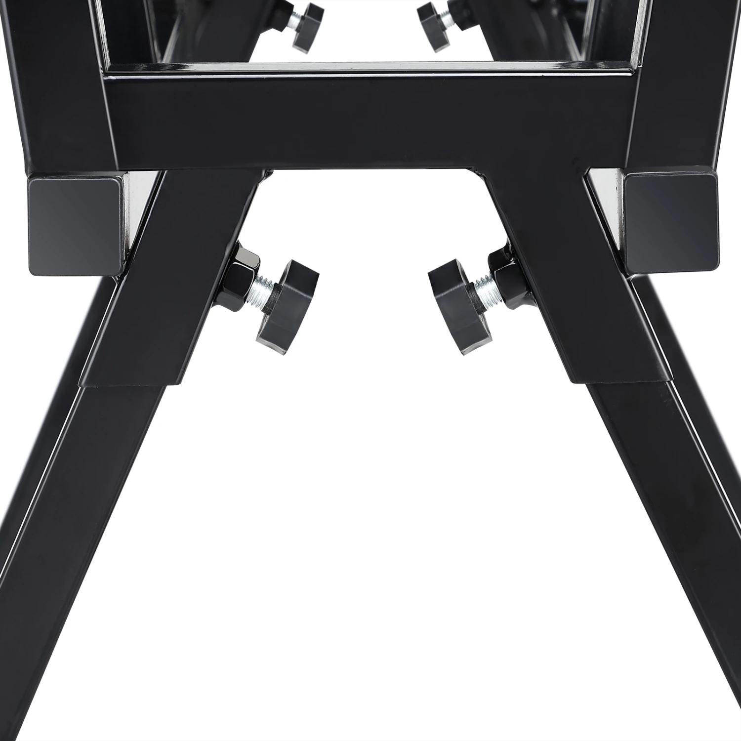 Die Füße sind höhenverstellbar und die Endstücke des Gestells sind mit Kunststoffkappen versehen. Der Sägebock hat außerdem einen Feststellbügel um das Holz beim Sägen zu sichern.