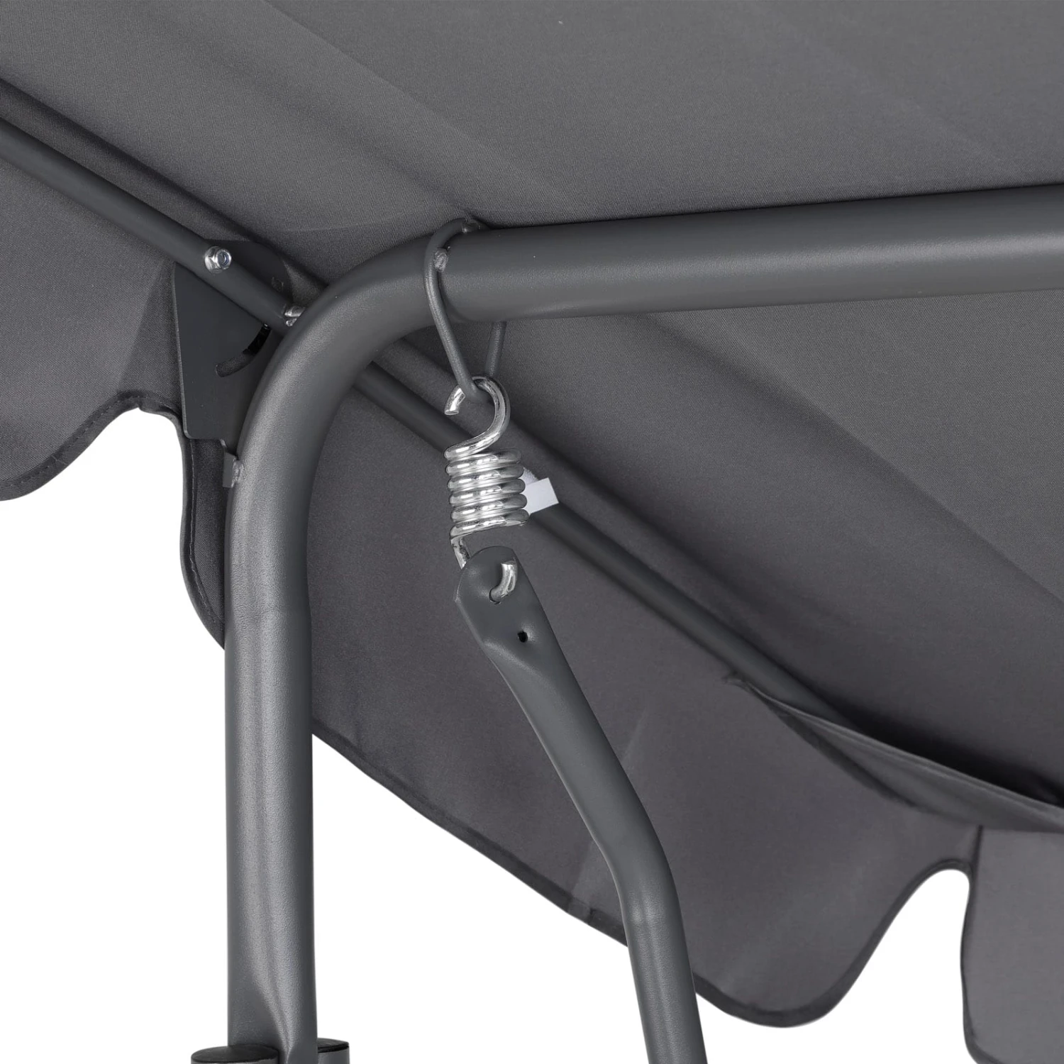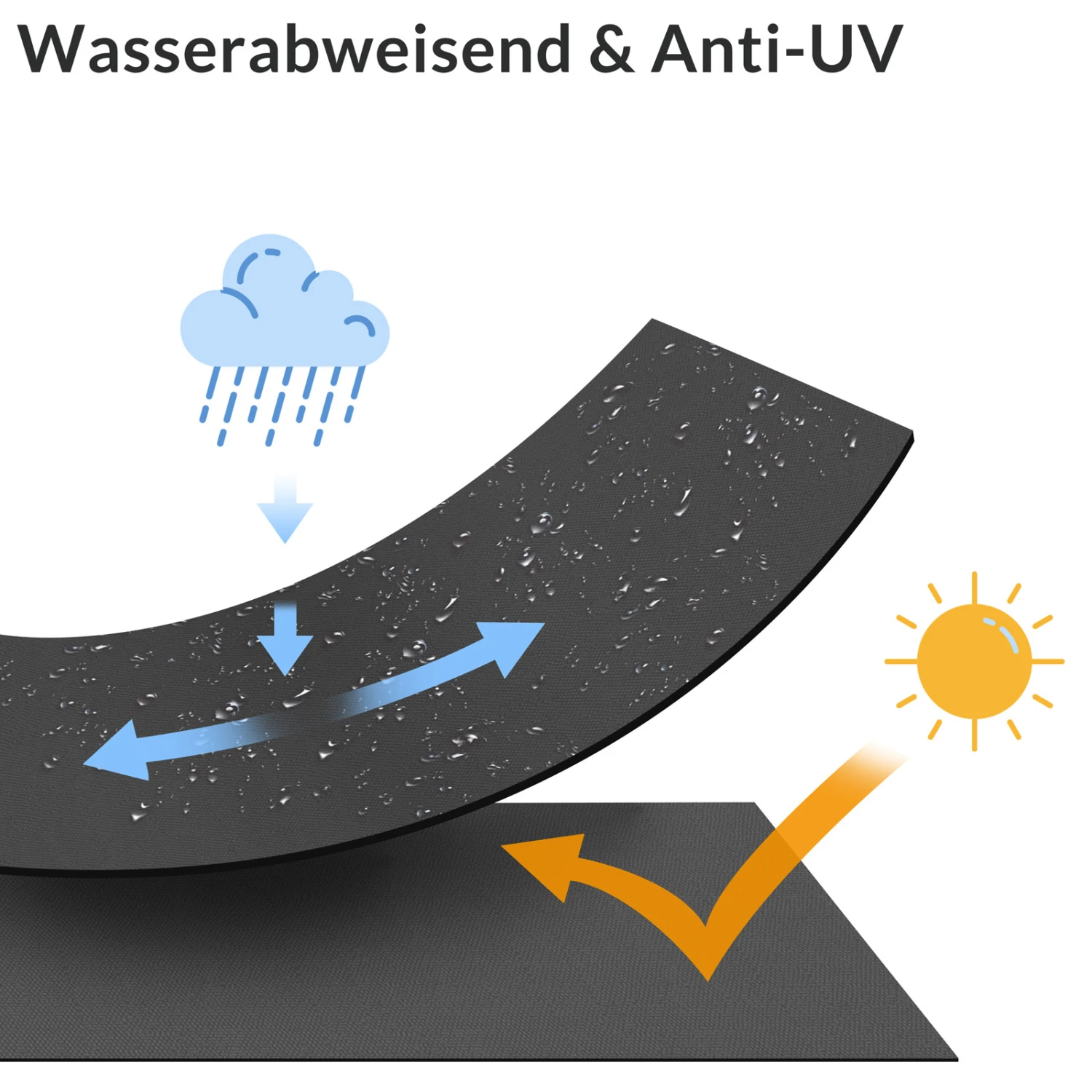 Das Polster sowie das Dach bestehen aus hochwertigem 600 x 300 D Oxford Stoff, der wasserabweisend und hervorragend für den Außenbereich geeignet ist.