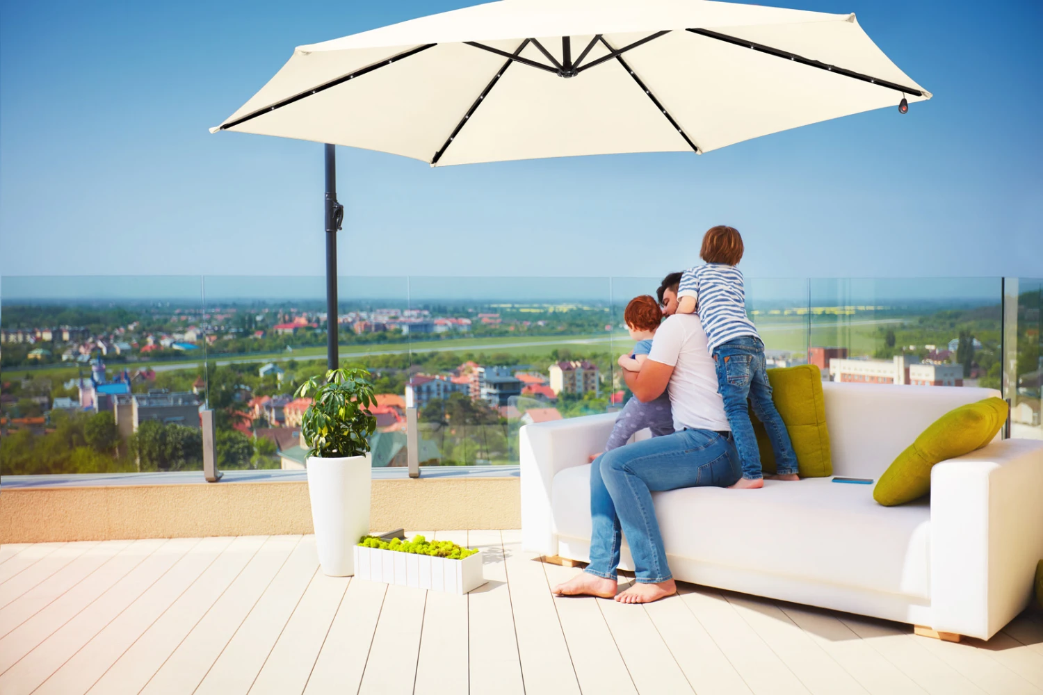 Der robuste Mast kann zum platzsparenden Transport praktisch zerlegt werden. Die Schirmbespannung ist wasserabweisend und bietet idealen Sonnenschutz im Garten, auf der Terrasse oder auf dem Balkon.