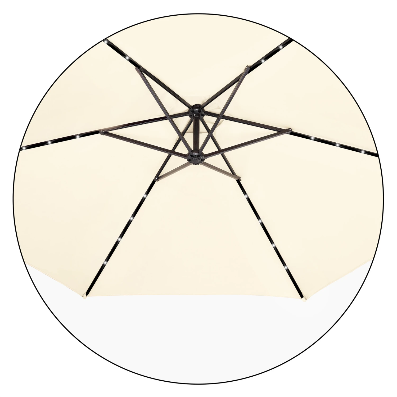 Die 24 LED Lampen sorgen mit ihrem stimmungsvollen Licht für ein angenehmes Ambiente. Strom liefert ein leistungsstarkes Solarpanel, das direkt oben am Schirm angebracht ist. Das Licht kann über einen kleinen und unauffälligen An-/Aus-Kippschalter gesteuert werden.