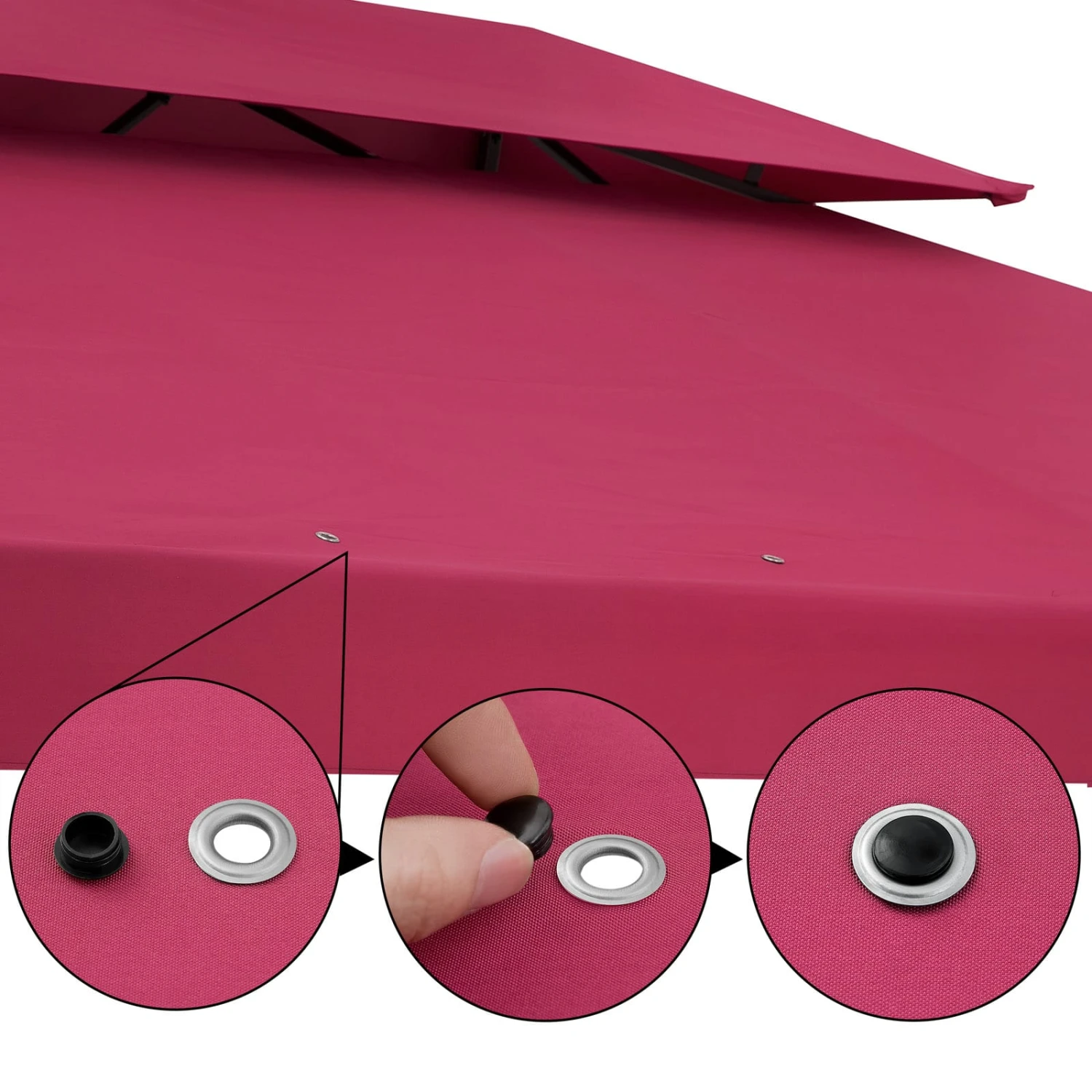 Die UV 50+ Dachbespannung besteht aus reißfestem Polyester und hat zusätzlich an der Innenseite eine wasserabweisende PU Beschichtung. Zudem kann das Dach mit Klettverschlüssen schnell und einfach am Gestänge befestigt werden, wodurch es stramm gespannt ist. Um die Bildung von Wassersäcken bei Regen zu vermeiden, sind Metallösen im Dach integriert. Diese können Sie nach Ihren Wünschen auch mit den mitgelieferten Kunststoffstopfen schließen.