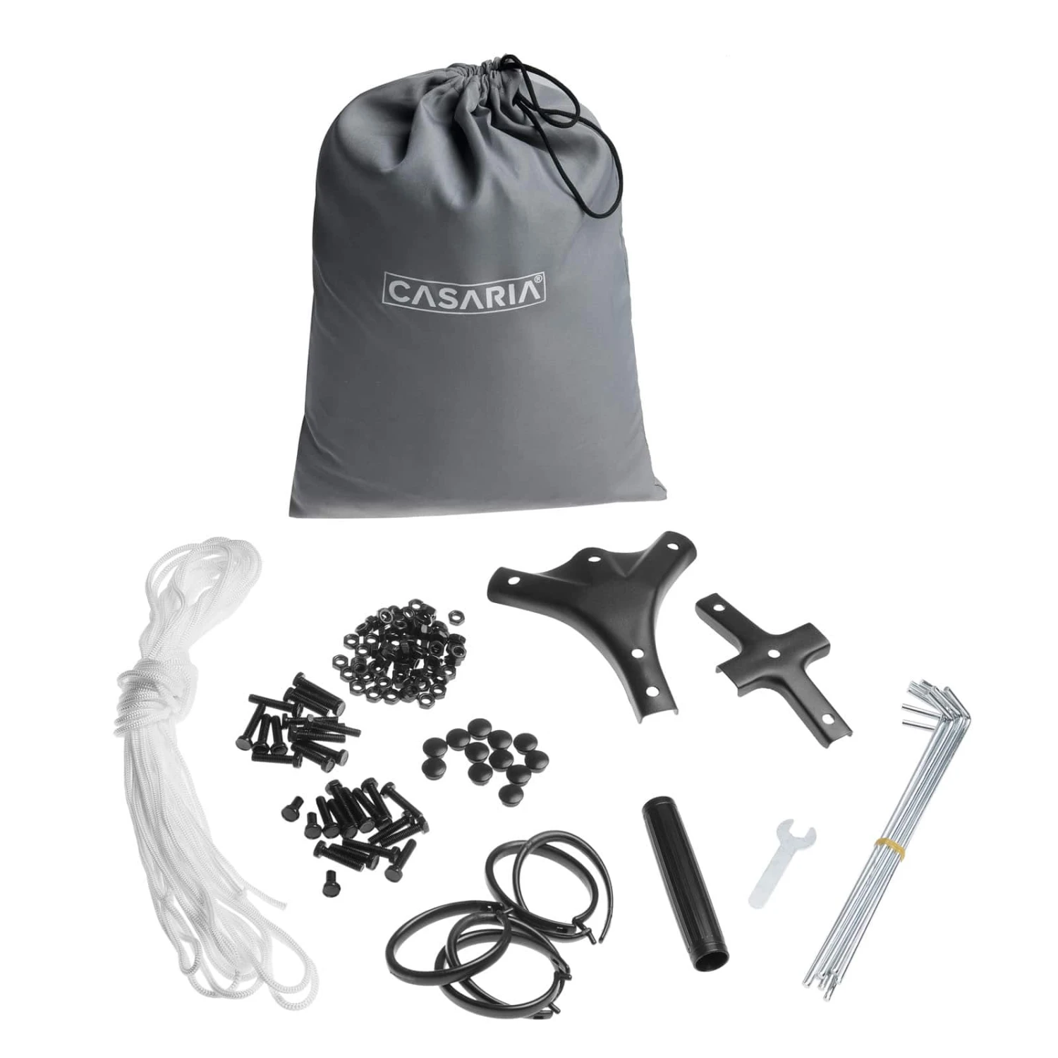 Die UV 50+ Dachbespannung besteht aus reißfestem Polyester und hat zusätzlich an der Innenseite eine wasserabweisende PU Beschichtung. Zudem kann das Dach mit Klettverschlüssen schnell und einfach am Gestänge befestigt werden, wodurch es stramm gespannt ist. Um die Bildung von Wassersäcken bei Regen zu vermeiden, sind Metallösen im Dach integriert. Diese können Sie nach Ihren Wünschen auch mit den mitgelieferten Kunststoffstopfen schließen.