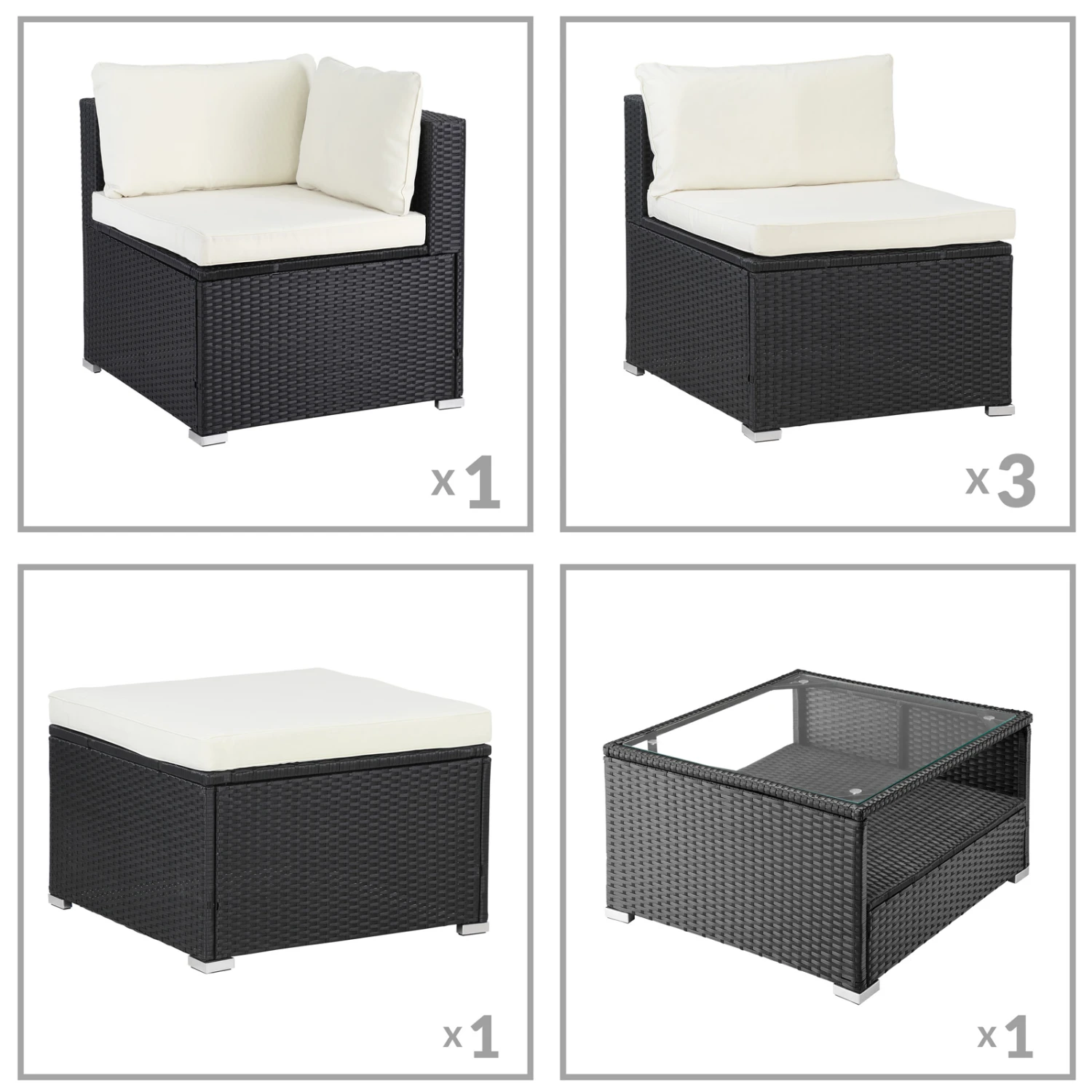 Jedes Element ist mit robusten Füßen ausgestattet, die zusätzlich für einen sicheren Stand auf Ihrer Terrasse sorgen. Um den Boden vor Kratzern zu schützen, sind die Füße mit zusätzlichen Plastikschonern ausgestattet. Die einzelnen Elemente des Sets können durch 6 Verbindungsclips miteinander verbunden werden.