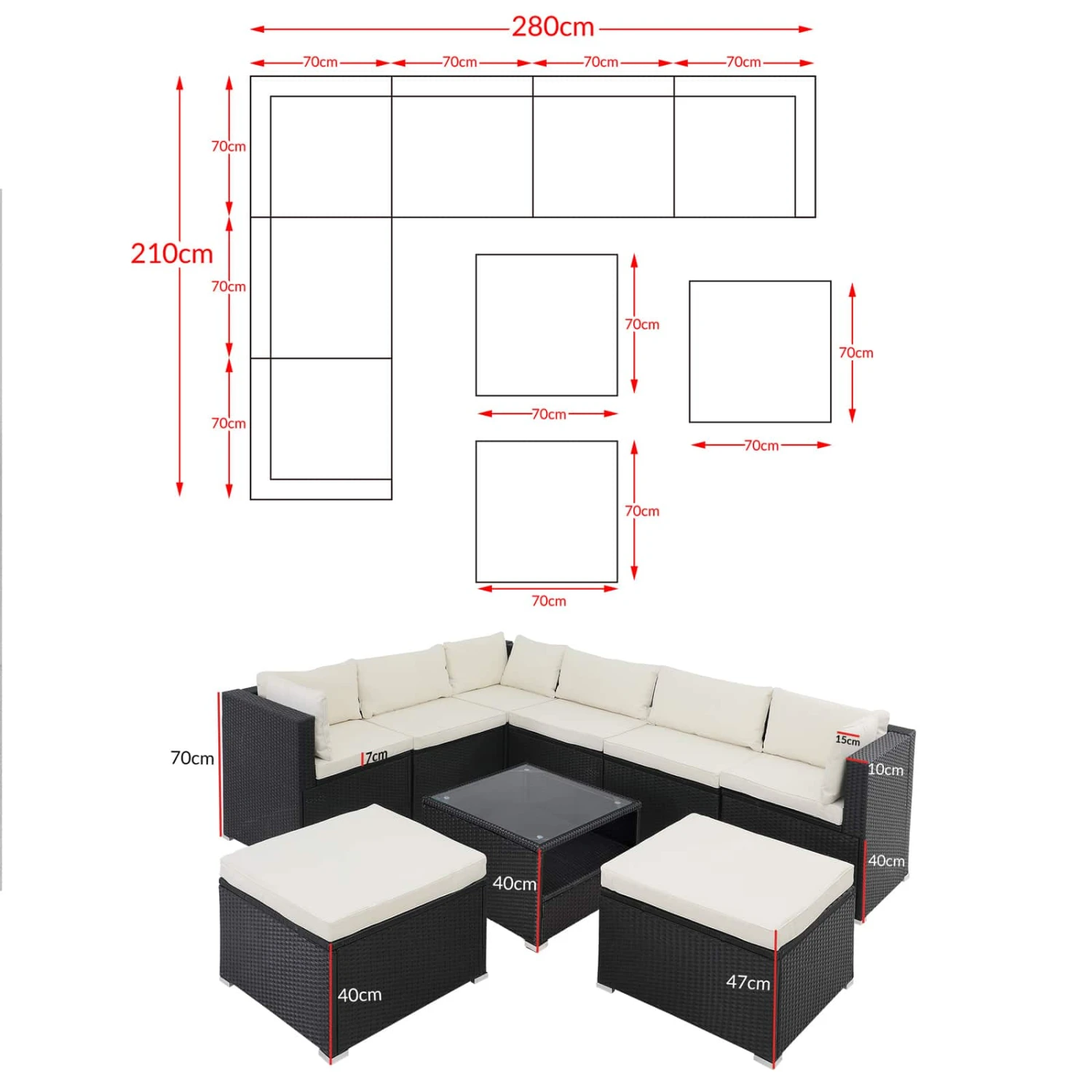 - Maße Sitzgarnitur (LxBxH): 280 x 210 x 70 cm