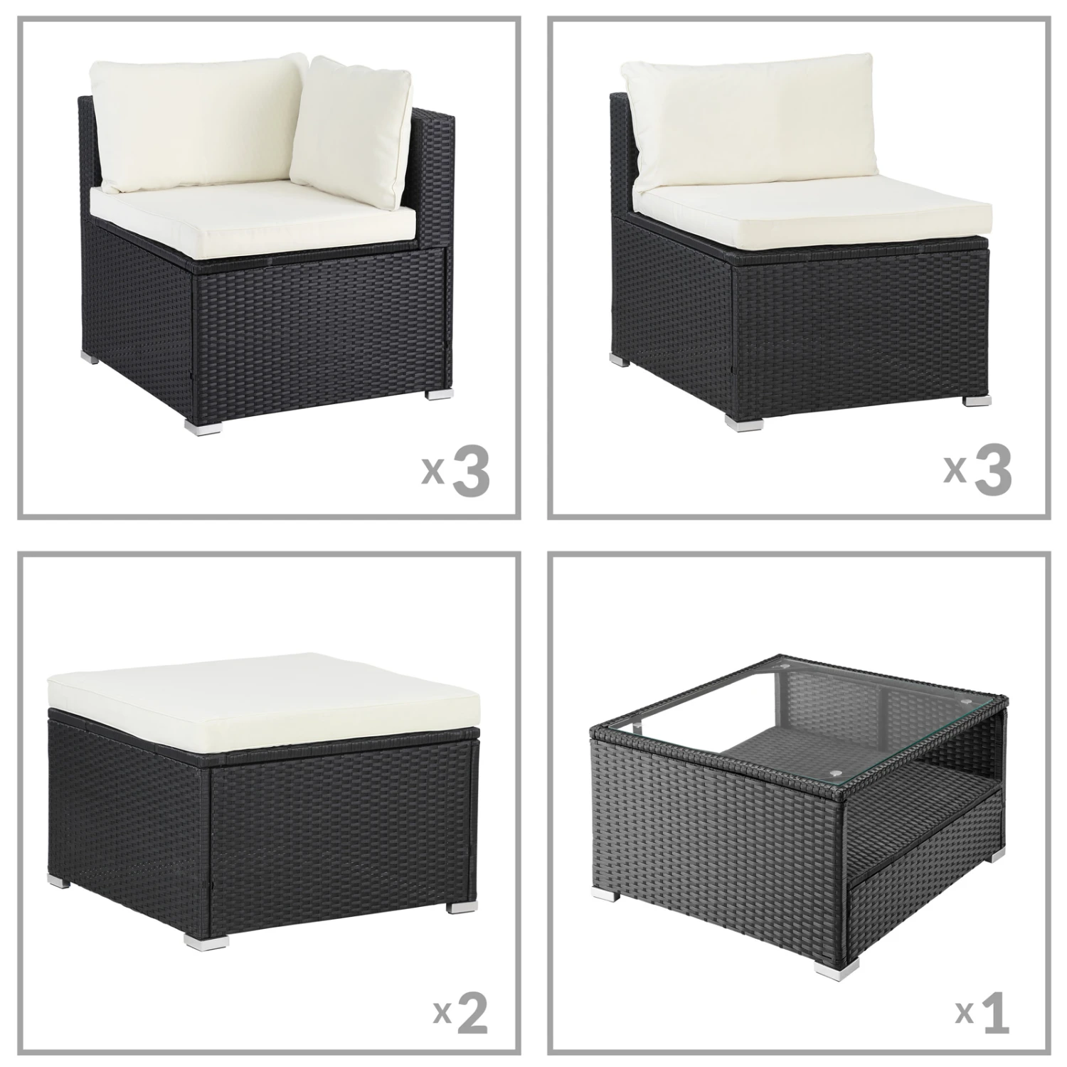 Diese Sitzgarnitur aus Polyrattan besticht durch die Vielzahl an Kombinationsmöglichkeiten. Jedes einzelne Element steht frei und lässt sich individuell nach Ihren Wünschen aufstellen. Die komfortablen Sitzflächen bieten eine Sitzhöhe von 50 cm. Die Einzelelemente lassen sich individuell miteinander kombinieren. Besonders elegant ist die extrabreite Rückenlehne, die für einen hohen Sitzkomfort sorgt.