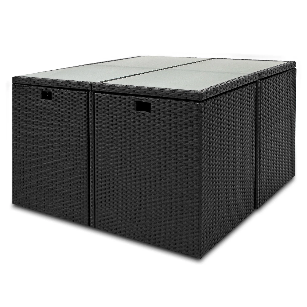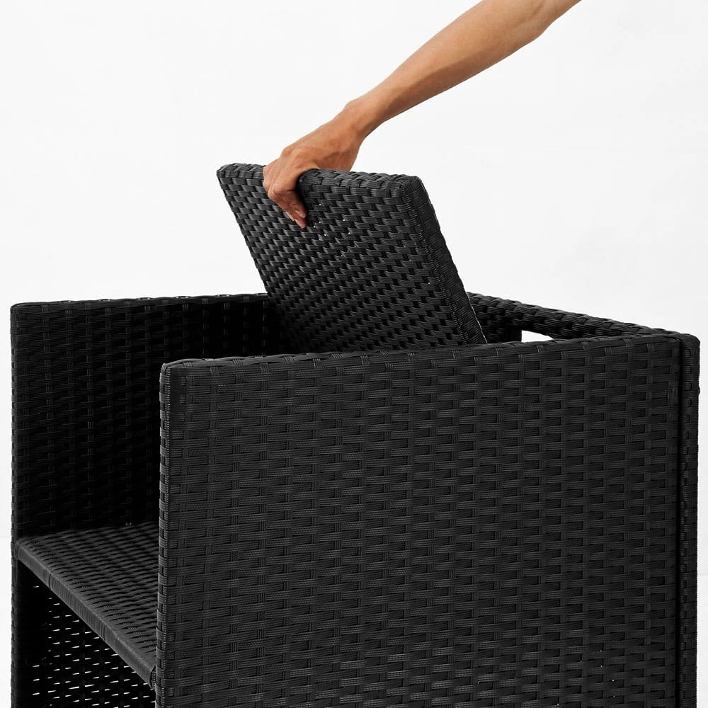 Polyrattan ist widerstandsfähig, schmutzabweisend und pflegeleicht. So können Sie die Garnitur sowohl drinnen, als auch draußen aufstellen.