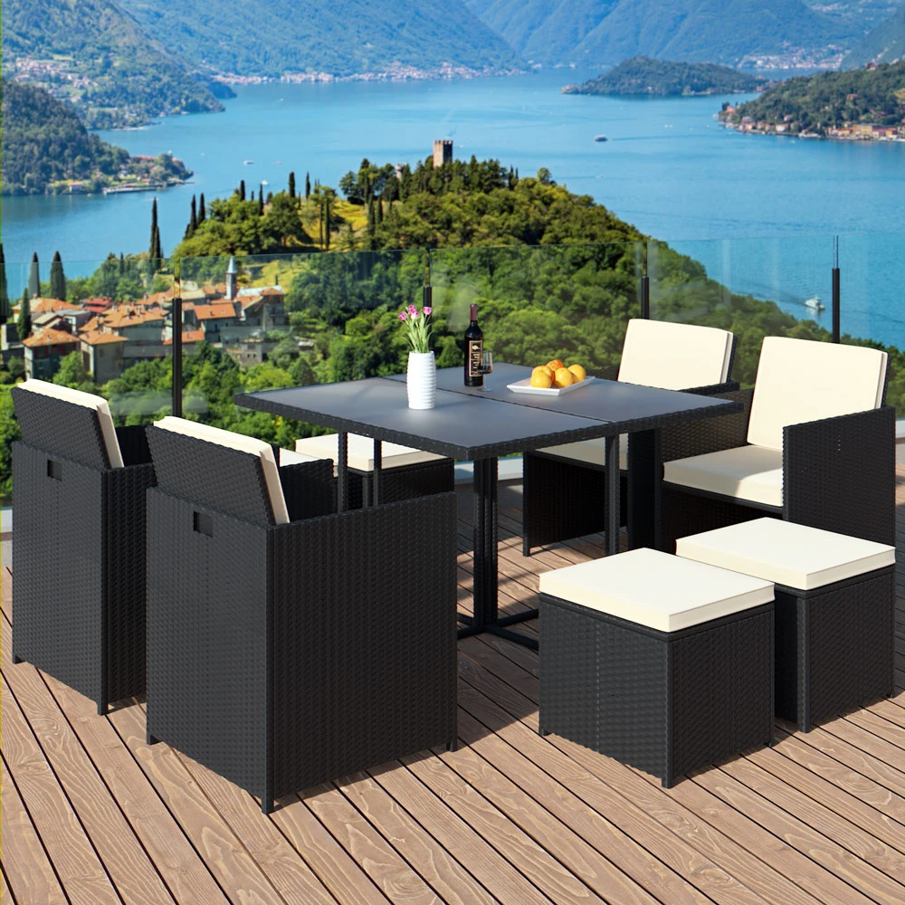 Die 21-tlg. Sitzgarnitur aus Polyrattan besteht aus einem Glastisch, 4 Hochlehnern, 4 Sitzhockern, 12 Polsterauflagen und ist für bis zu 8 Personen geeignet.