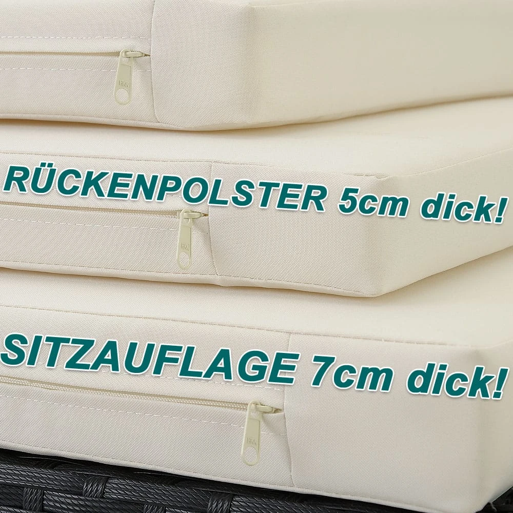 Wasserabweisende Sitzauflagen laden zum angenehmen Entspannen ein. Ausgestattet mit praktischem Reißverschluss, lassen sich die Bezüge einfach reinigen.