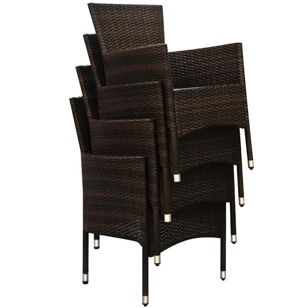 Polyrattan-Set für 8 Personen inkl. Auflagen. Es besteht aus einem Tisch, 8 stapelbaren Stühlen mit 8 abnehmbaren Kissen (doppelt gekettelt).