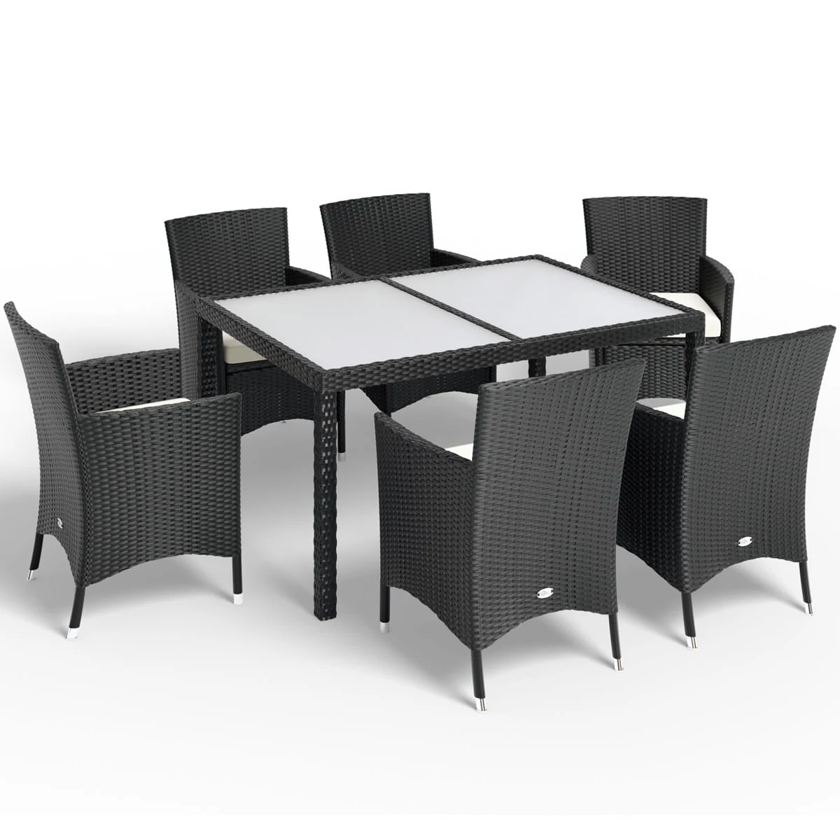 Das Gartenmöbel-Set besteht aus 1 Gartentisch und 6 stapelbaren Stühlen mit 7 cm dicken, abnehmbaren Sitzauflagen für besten Sitzkomfort.