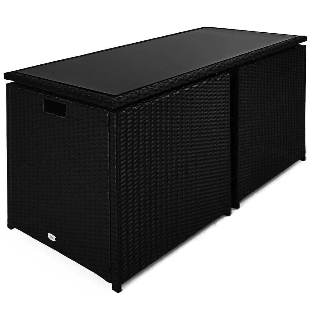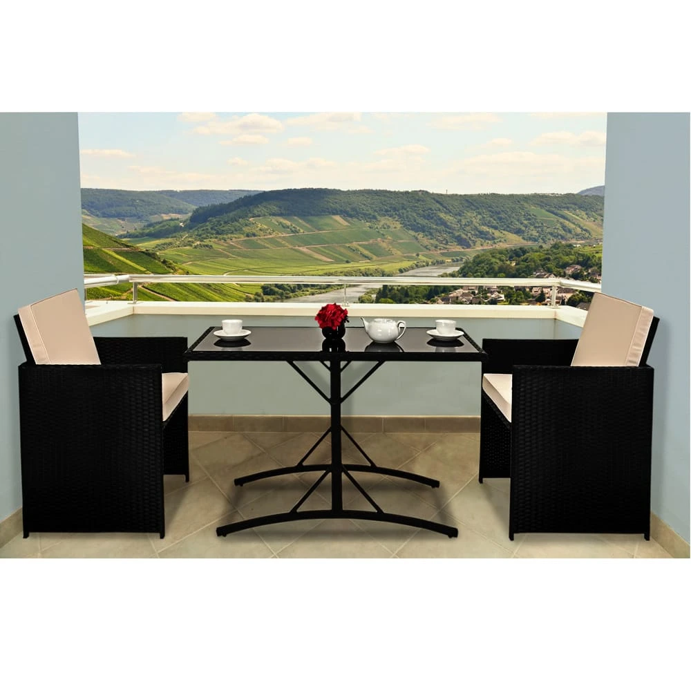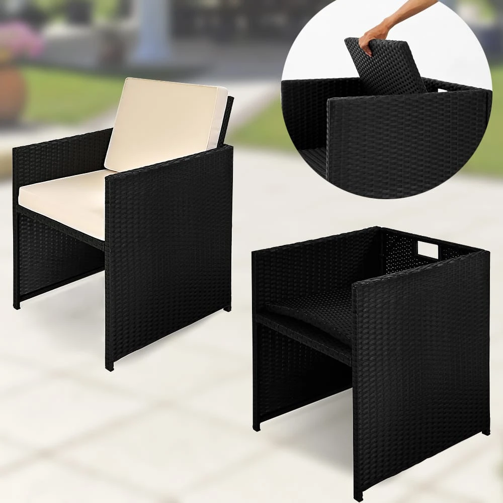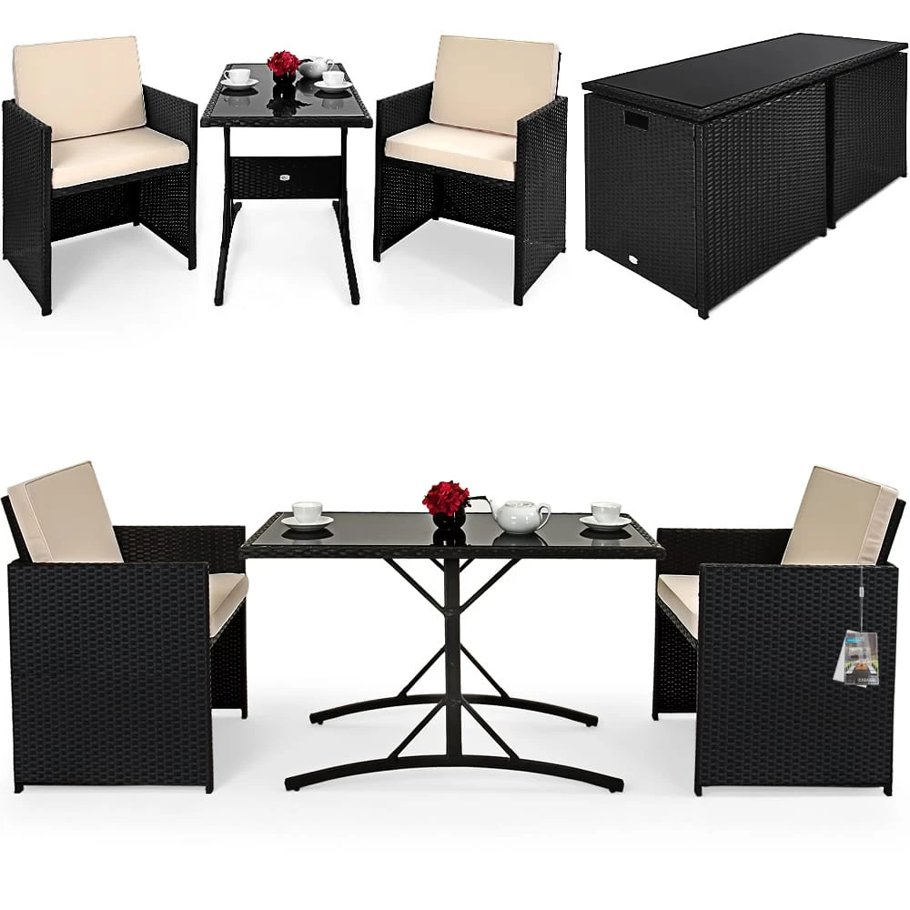 Das Polyrattan Set besteht aus 1 Tisch und 2 Stühlen mit 4 abnehmbaren Kissen. Die Rückenlehnen der beiden Stühle sind klappbar. Dadurch ergibt sich das besonders praktische geringes Aufstellmaß, wenn alle Elemente ineinander gestellt sind.