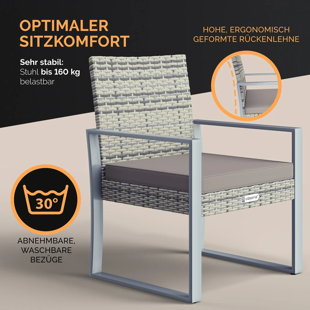 Mit diesem 3-teiligen Set von Casaria® hast du alles, was du für gemütliche Sommerstunden im Garten oder auf dem Balkon brauchst: zwei weich gepolsterte Stühle für dich und Besuch und einen kompakten Tisch für Limo, Knabbereien oder einen Cocktail bei Sonnenuntergang.