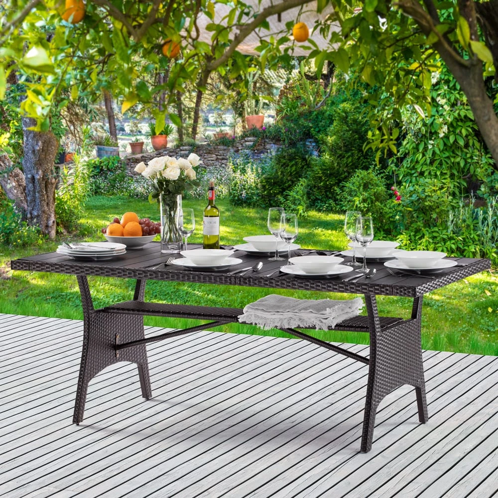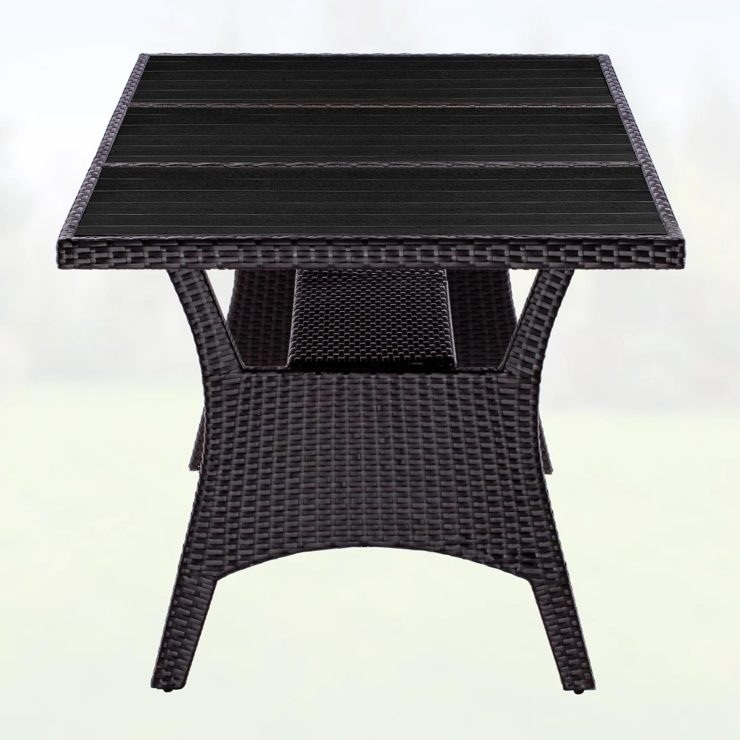 Dieser exklusive Polyrattan Gartentisch ist mit einer sehr robusten und widerstandsfähigen Tischplatte aus WPC in Holzoptik ausgestattet. Dadurch ist der Tisch vor Wind und Wetter gut geschützt und ideal für den Garten, die Terrasse oder im Haus geeignet.