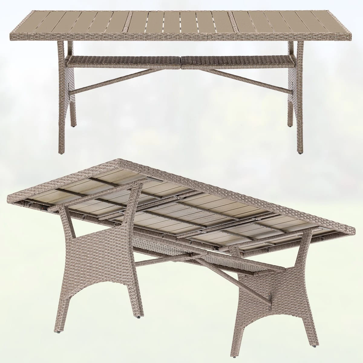 Dieser exklusive Polyrattan Gartentisch ist mit einer sehr robusten und widerstandsfähigen Tischplatte aus WPC in Holzoptik ausgestattet. Dadurch ist der Tisch vor Wind und Wetter gut geschützt und ideal für den Garten, die Terrasse oder im Haus geeignet.