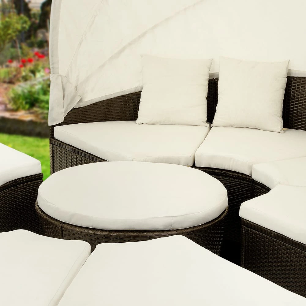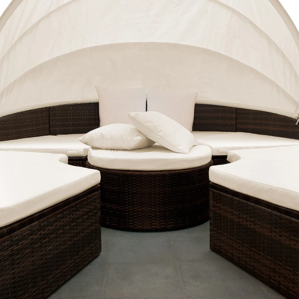 Diese trendige Sonneninsel in zeitloser Polyrattanoptik ist ein Highlight für jede Terrasse oder Indoor-Wohnbereiche.