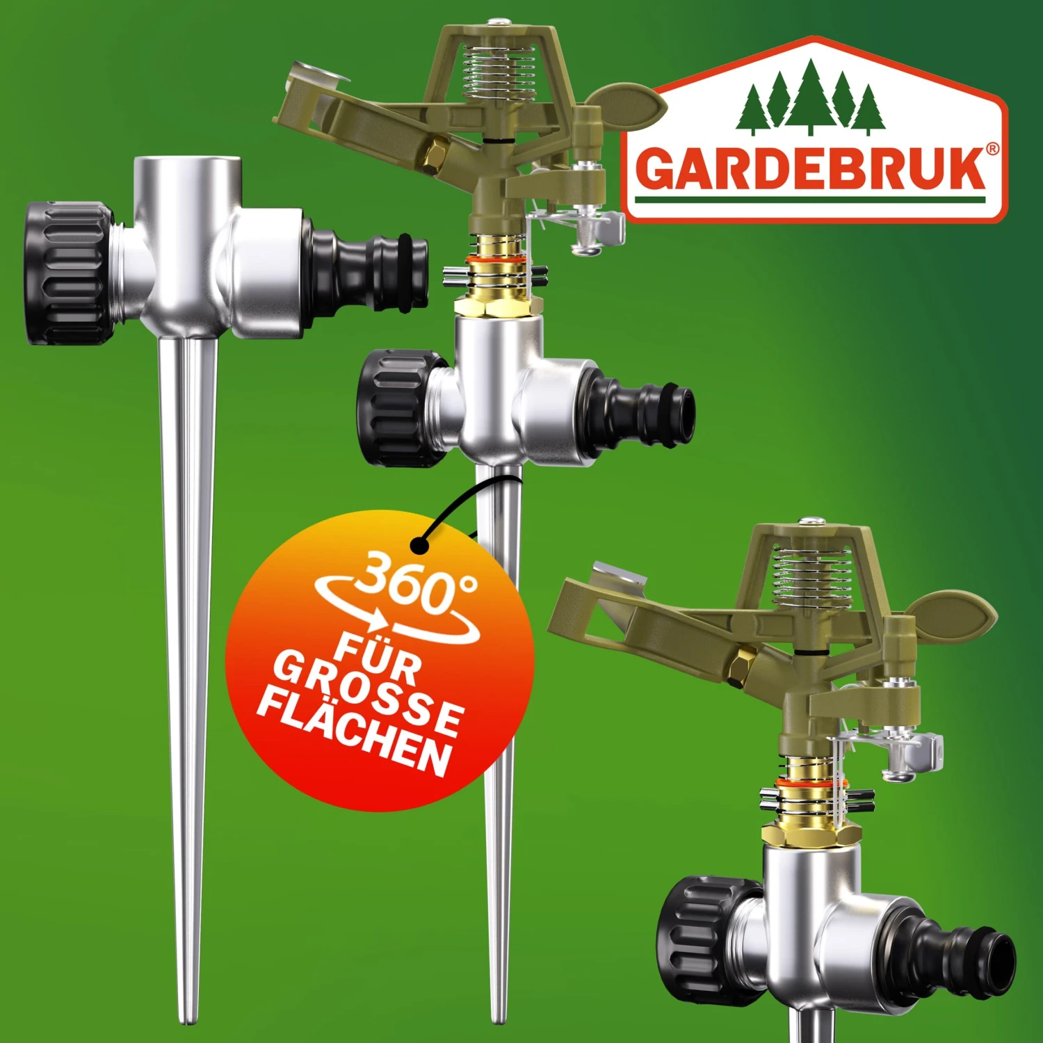 Zusätzlich erhalten Sie einen 360° Sprühaufsatz. Der Rasensprenger ist für alle handelsüblichen Gartenschläuche geeignet.