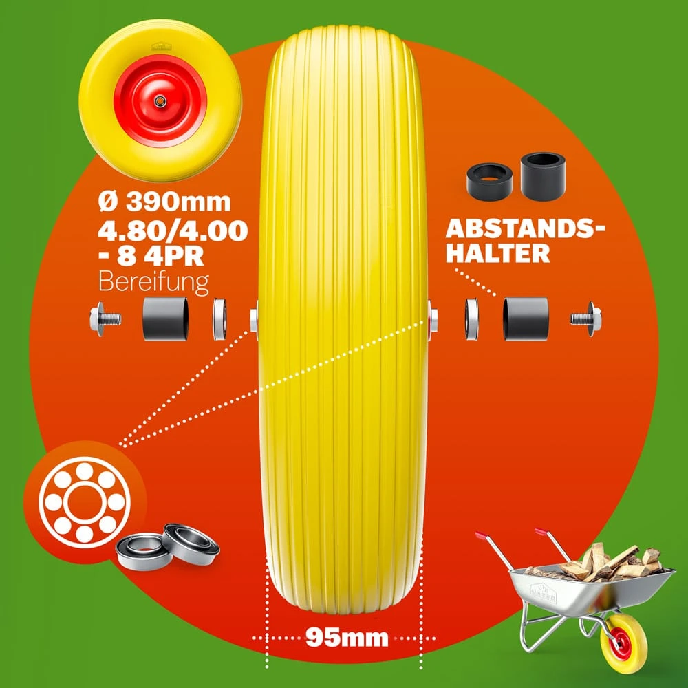 Sie sind es leid, andauernd Ihr Schubkarrenrad aufzupumpen oder gar austauschen zu müssen? Kein Problem mit diesem pannensicheren PU – Rad mit robuster Stahlfelge und Kugellager für leichtes Fahren.