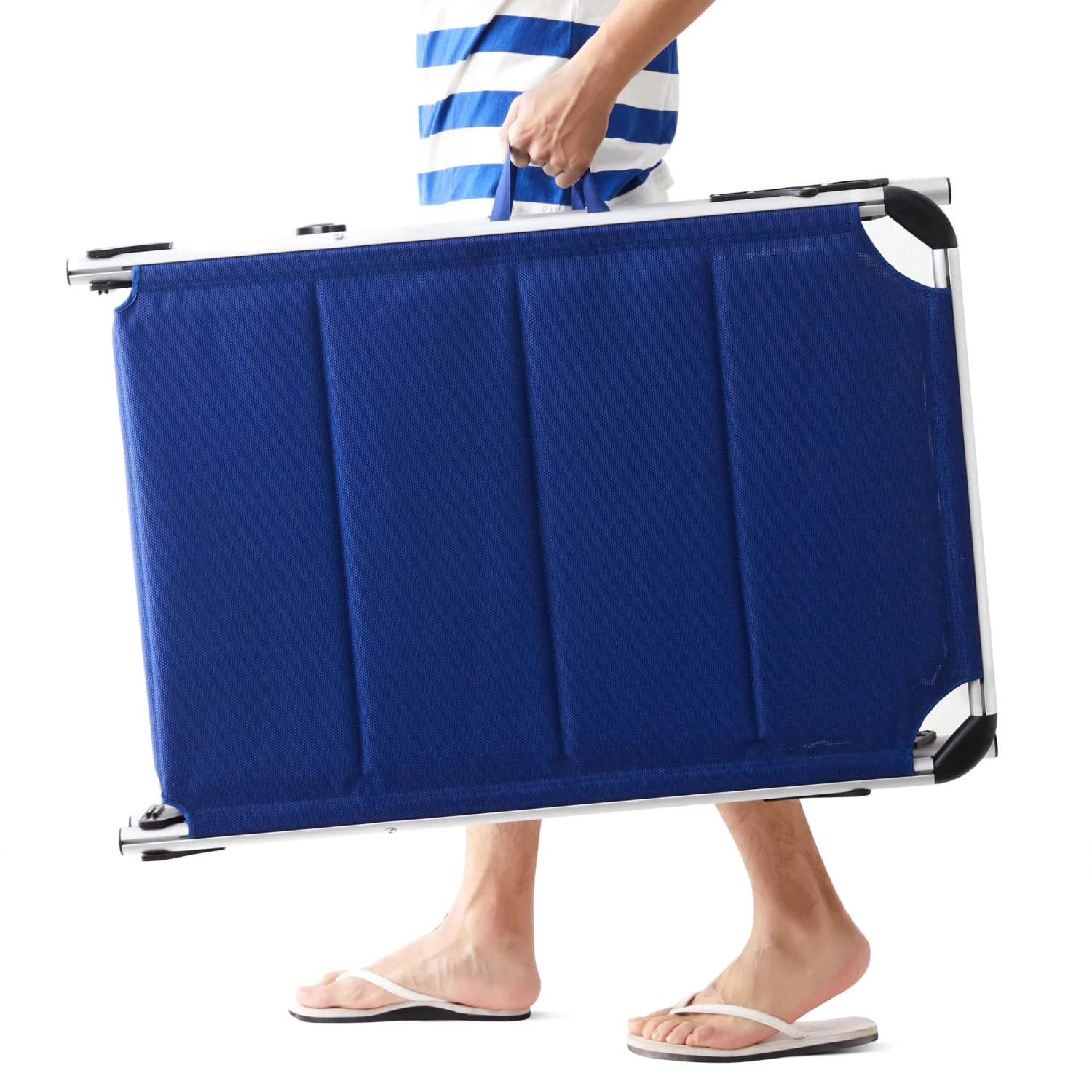 Zusammengeklappt ist die leichte Aluliege schnell und platzsparend verstaut. Die Tragegriffe ermöglichen einen einfachen Transport.