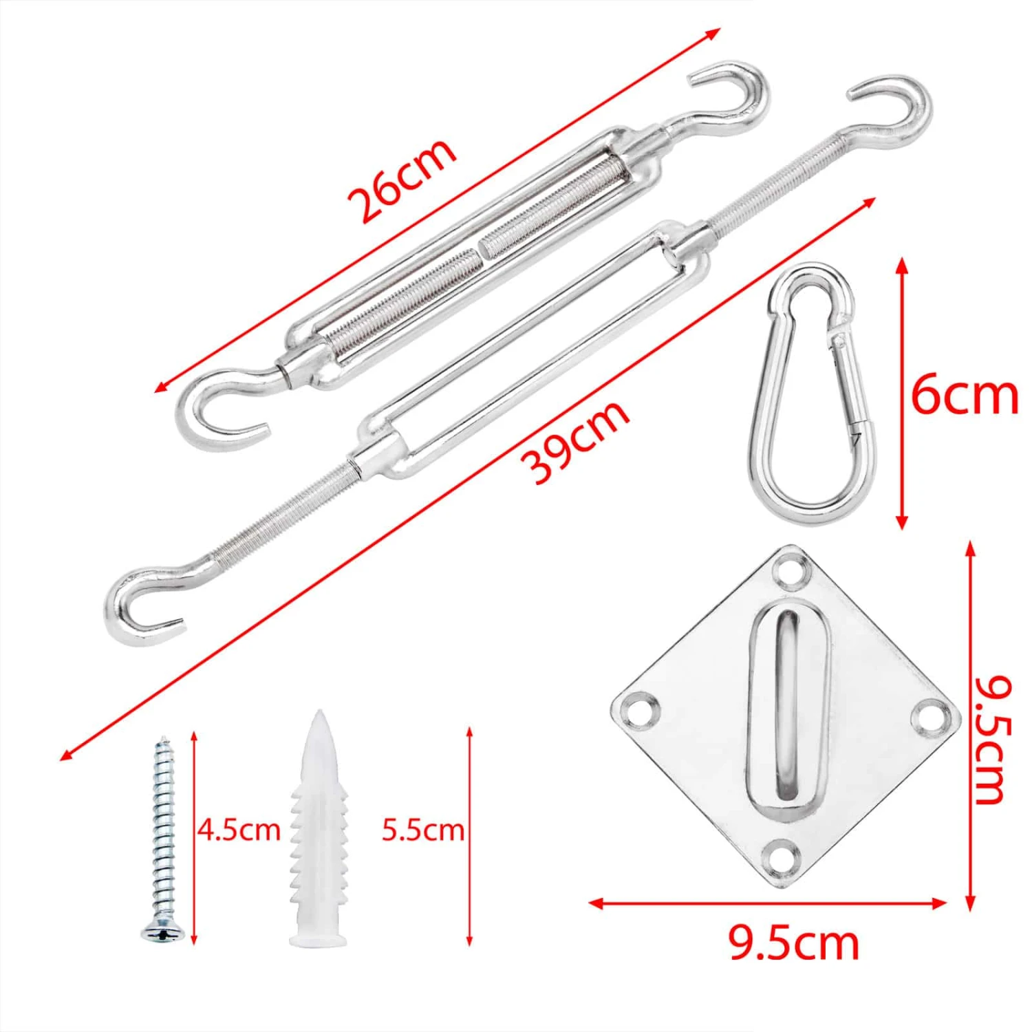 Die Spannschrauben bieten einen Spannbereich von 251 – 381mm. Hiermit lässt sich das Sonnensegel auch nach der Montage auf Ihre Wünsche nachspannen.Das ermöglicht Ihnen eine optimale Befestigung Ihres Sonnensegels.
